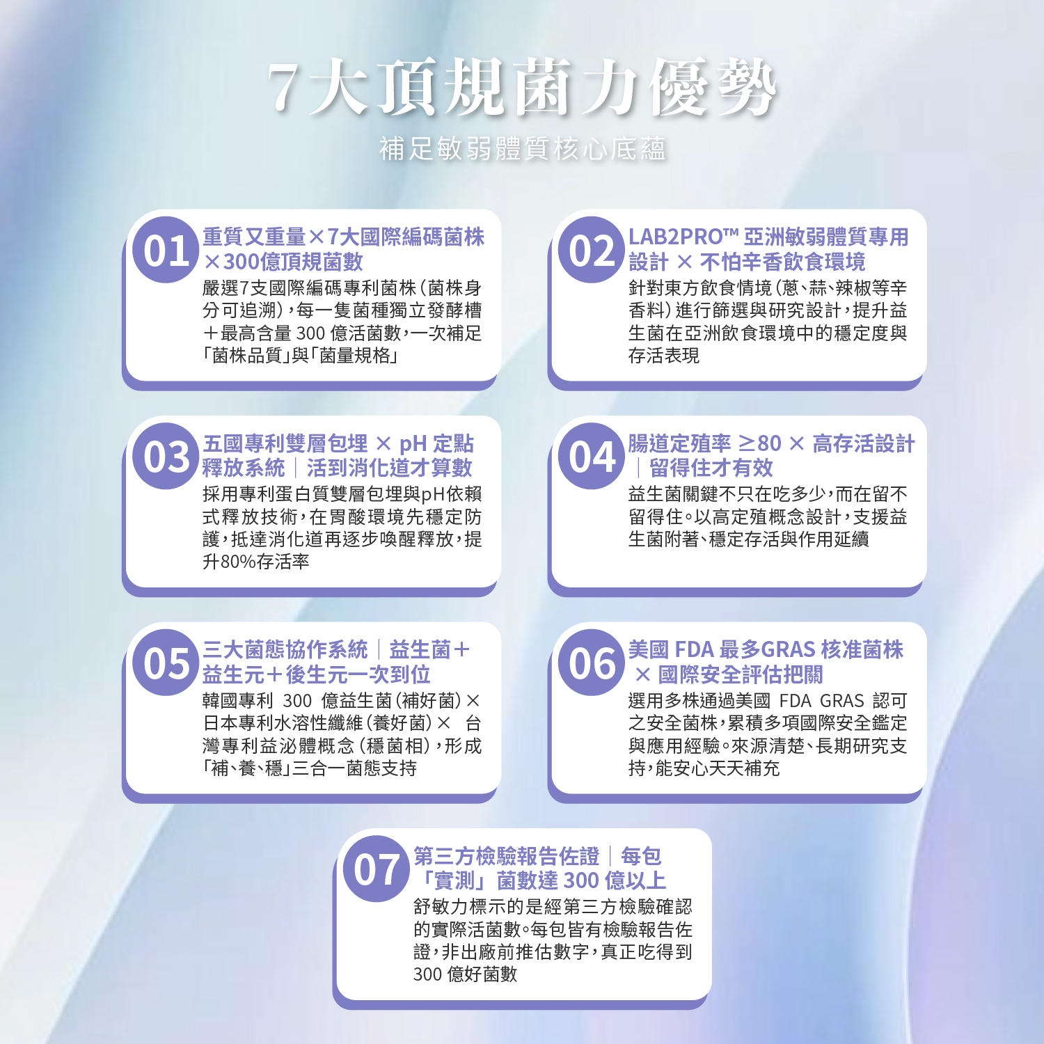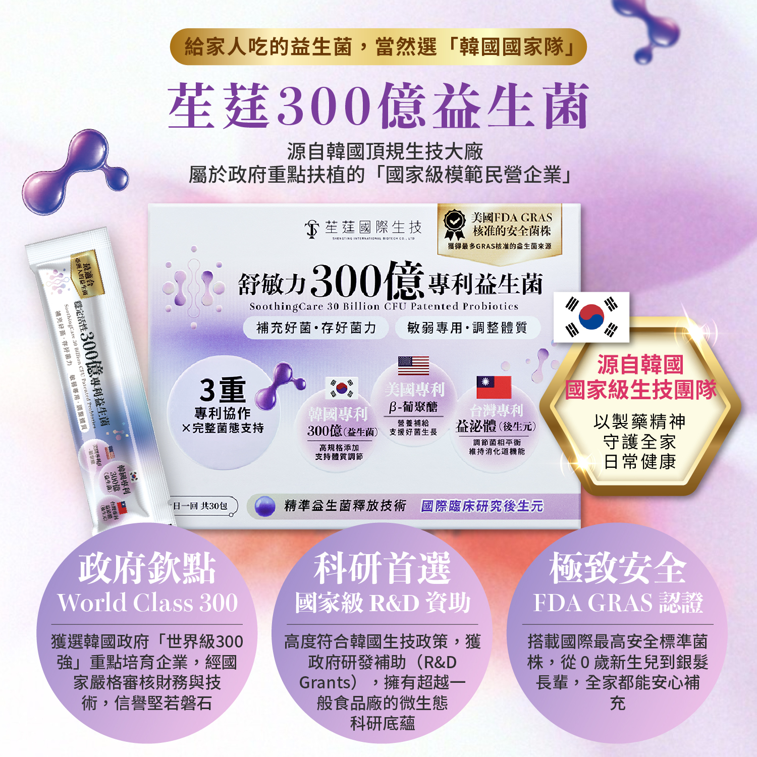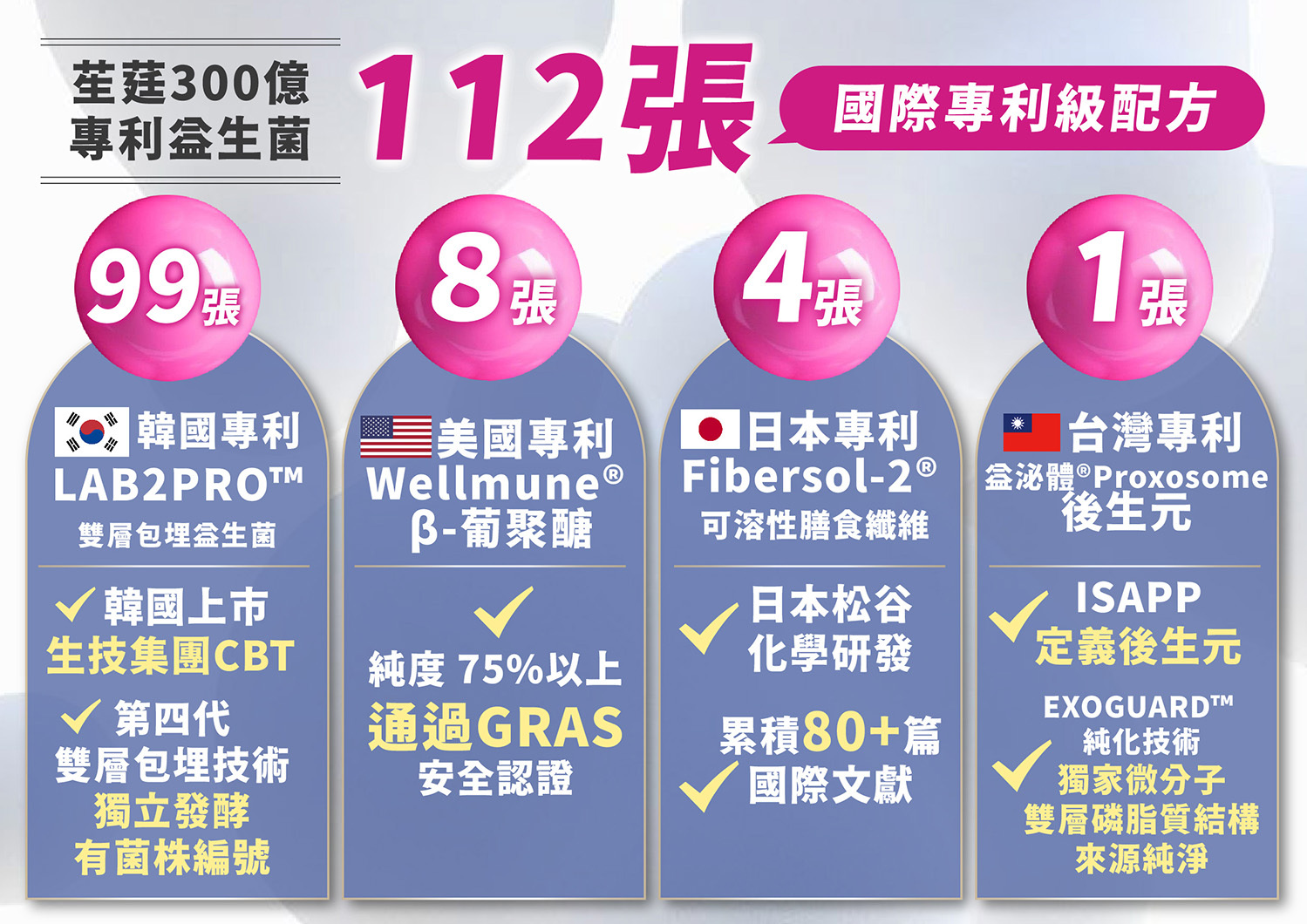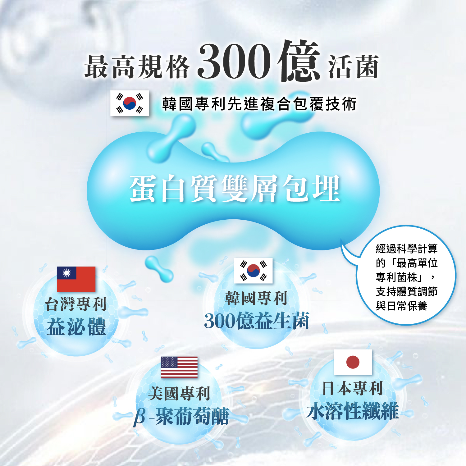 ▸獨家三大菌態協作系統:韓國專利300億好菌+日本專利水溶性膳食纖維+台灣專利益泌體後生元