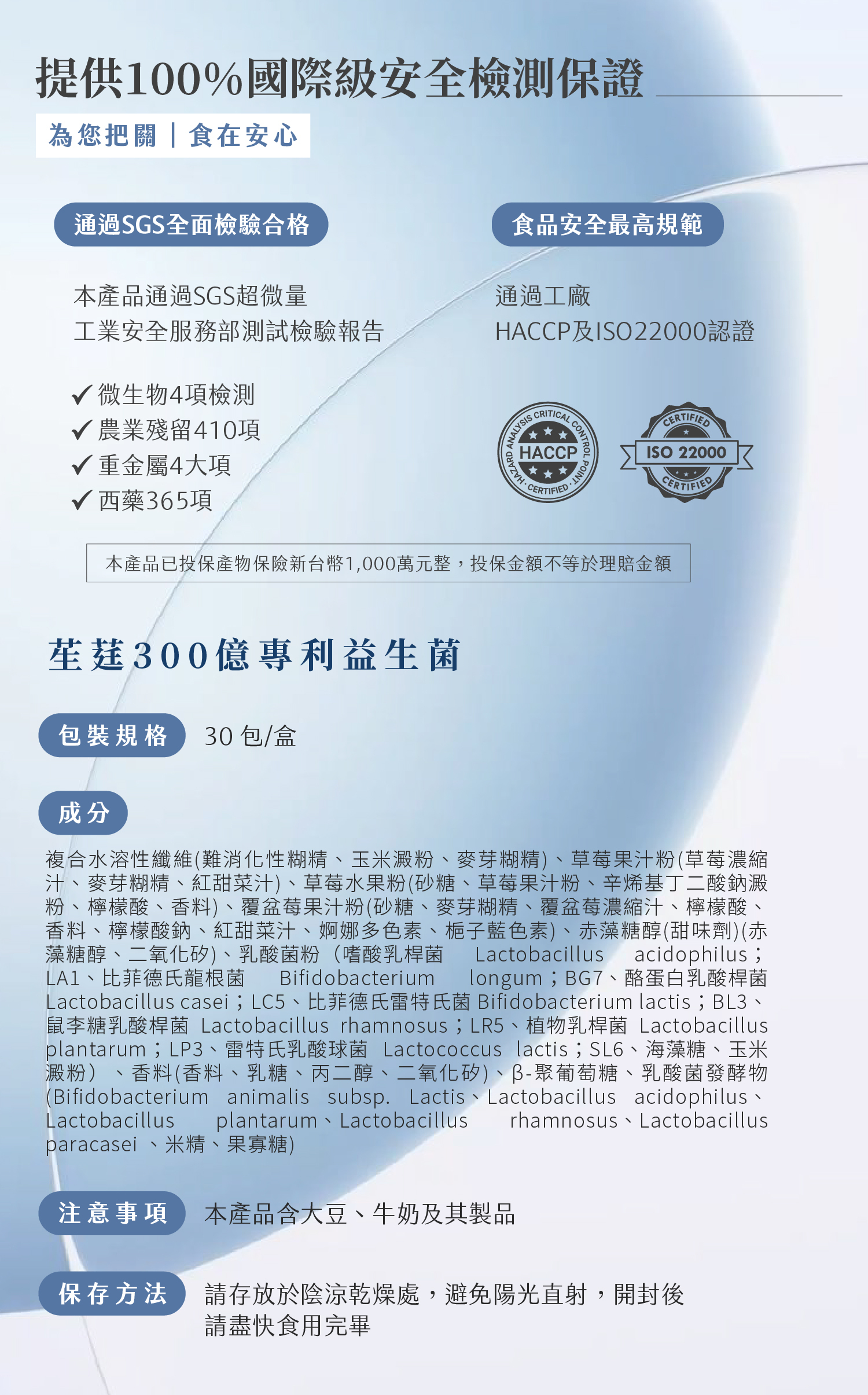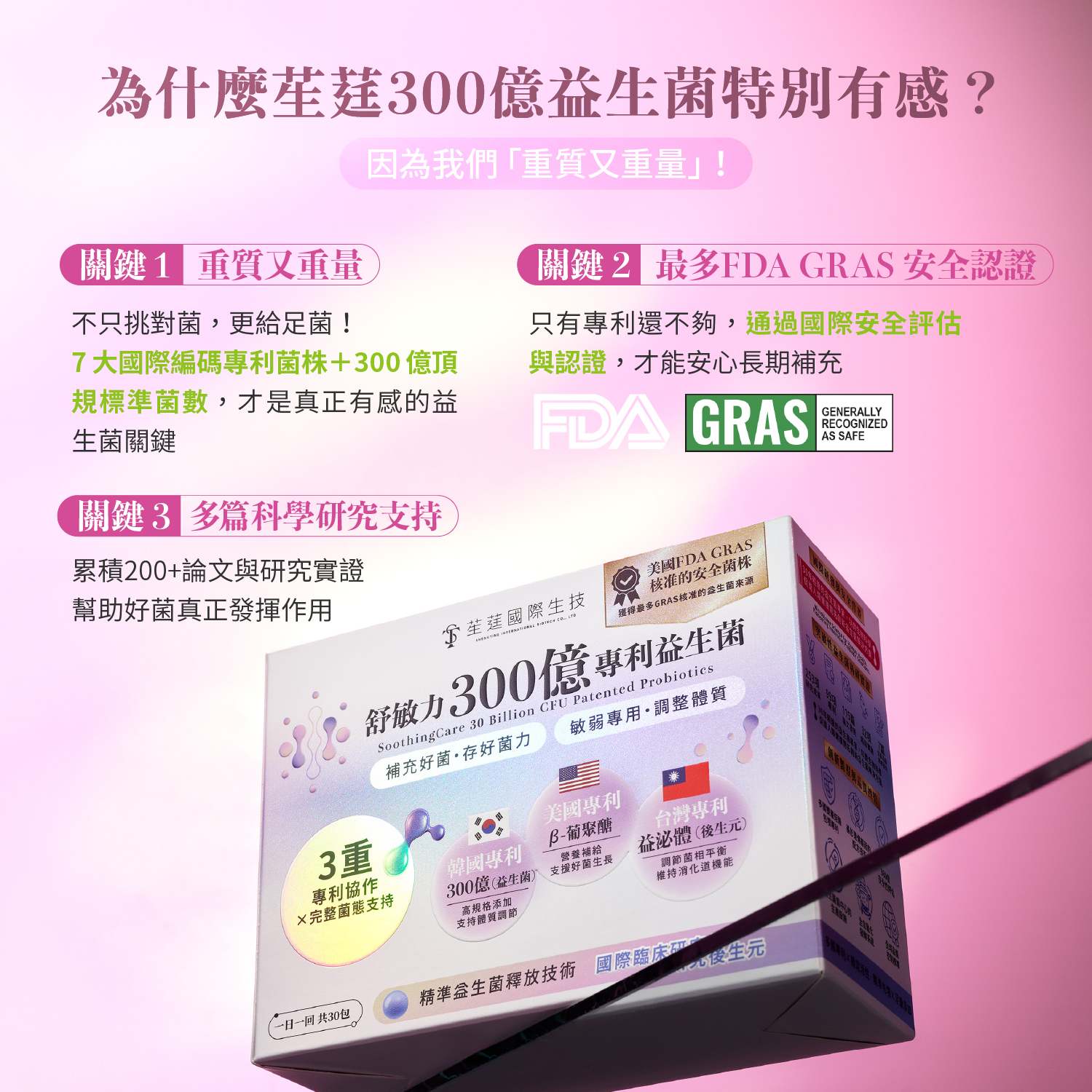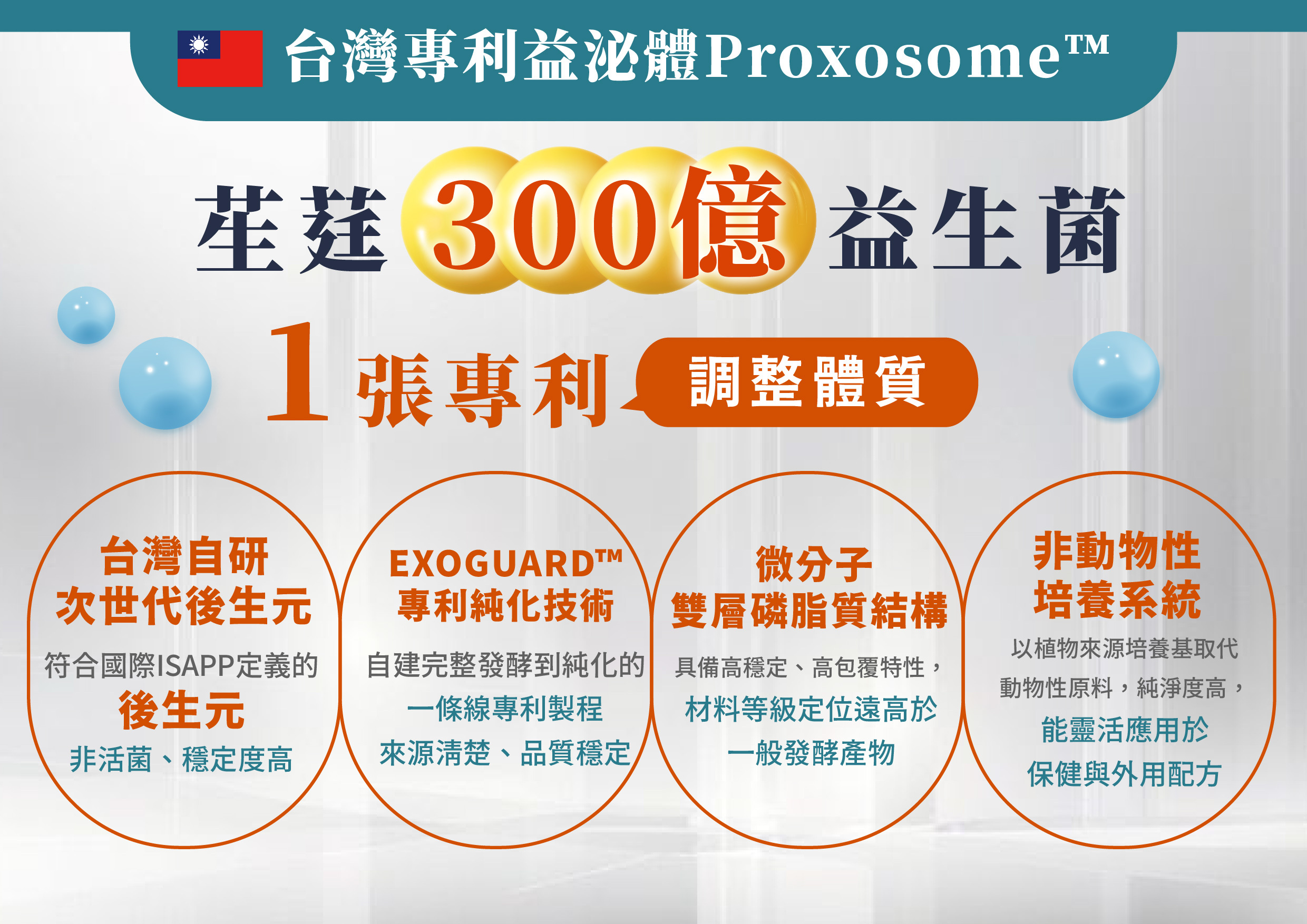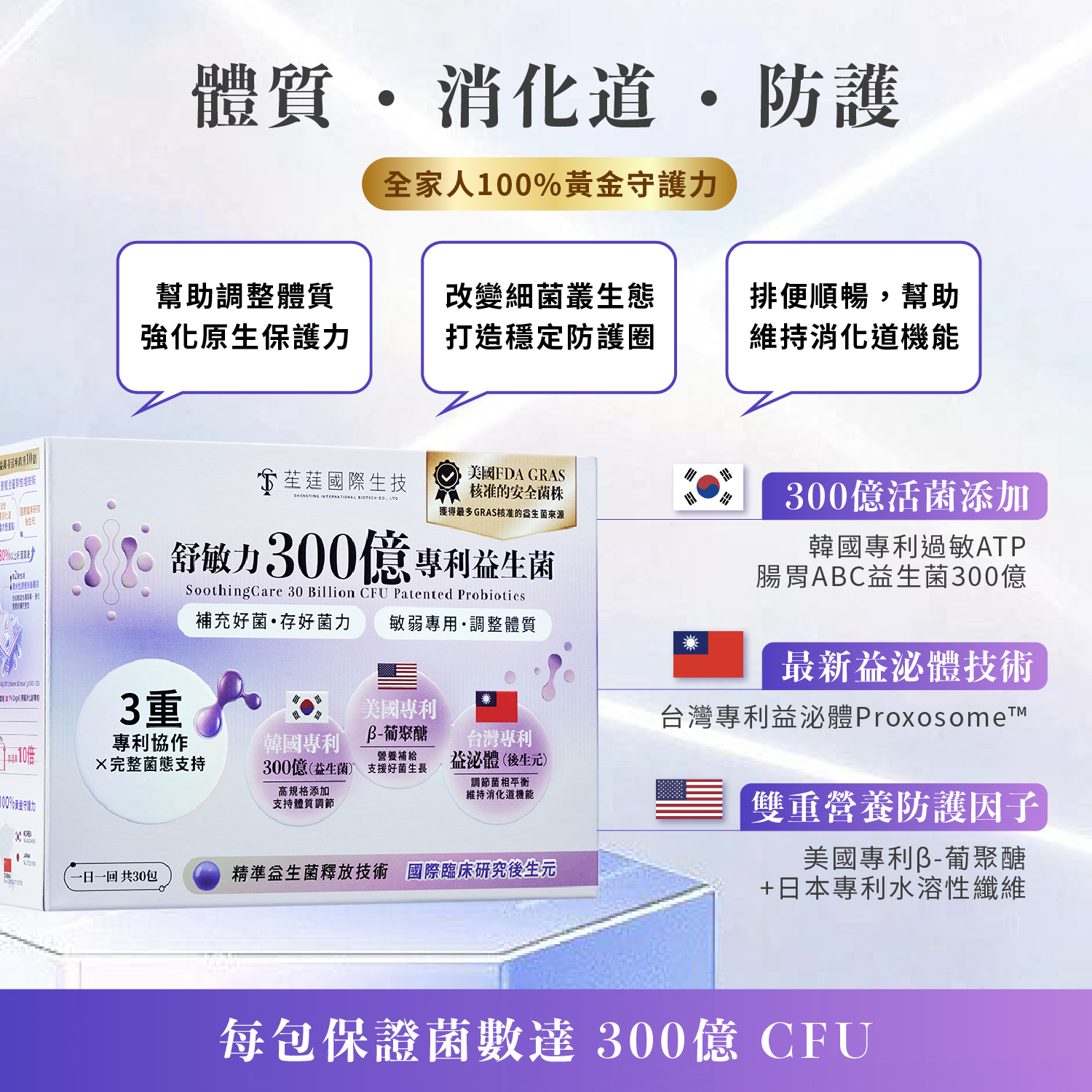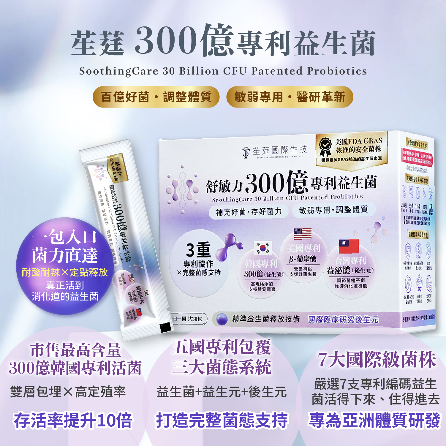 ▸獨家三大菌態協作系統:韓國專利300億好菌+日本專利水溶性膳食纖維+台灣專利益泌體後生元