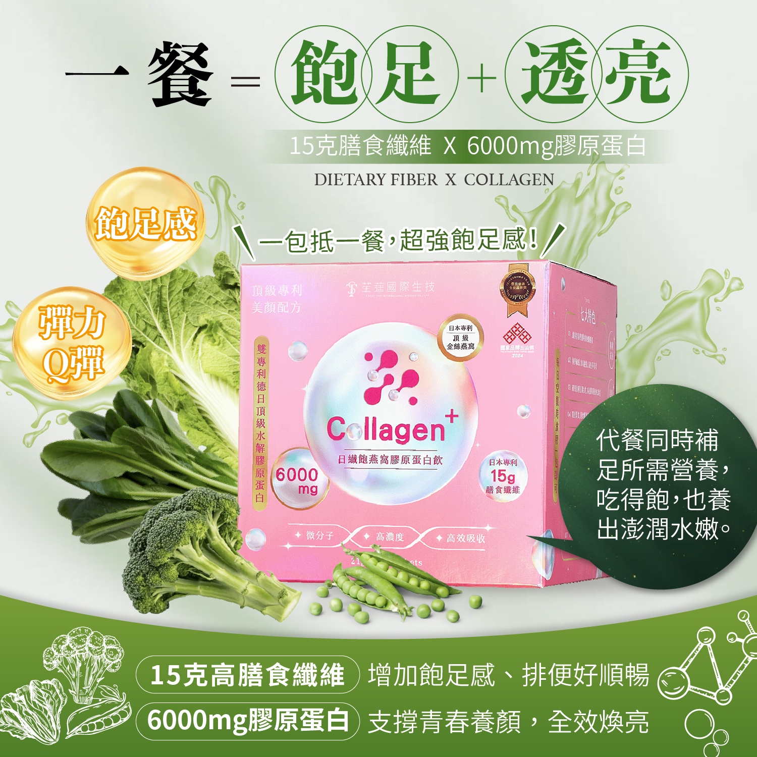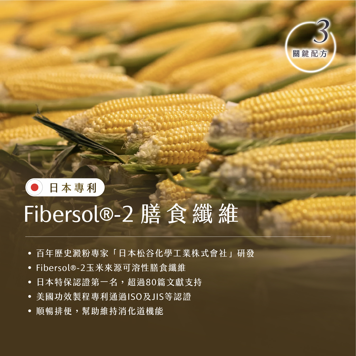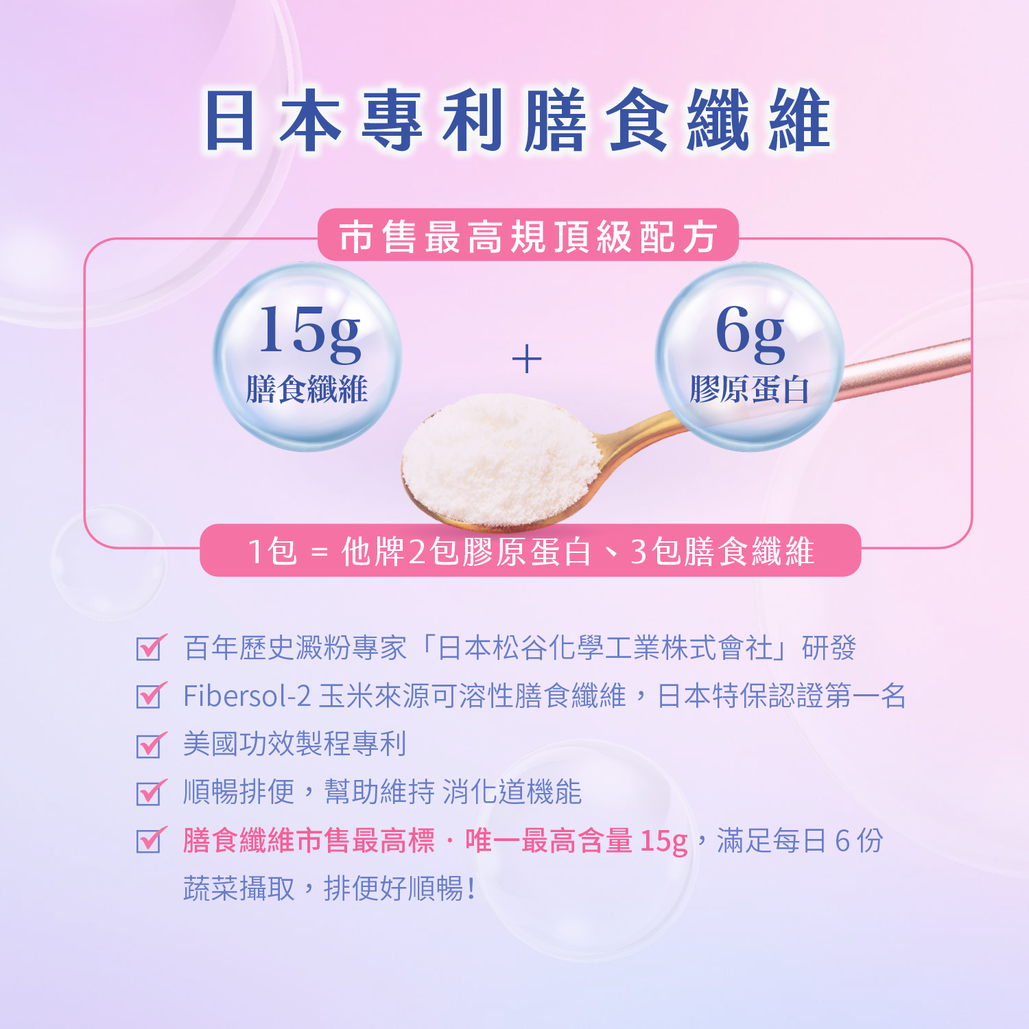 ✅全台最高、每包含「日本專利Fibersol®-2膳食纖維15克」,輕鬆補足成人一日所需25g膳食纖維的60%需求