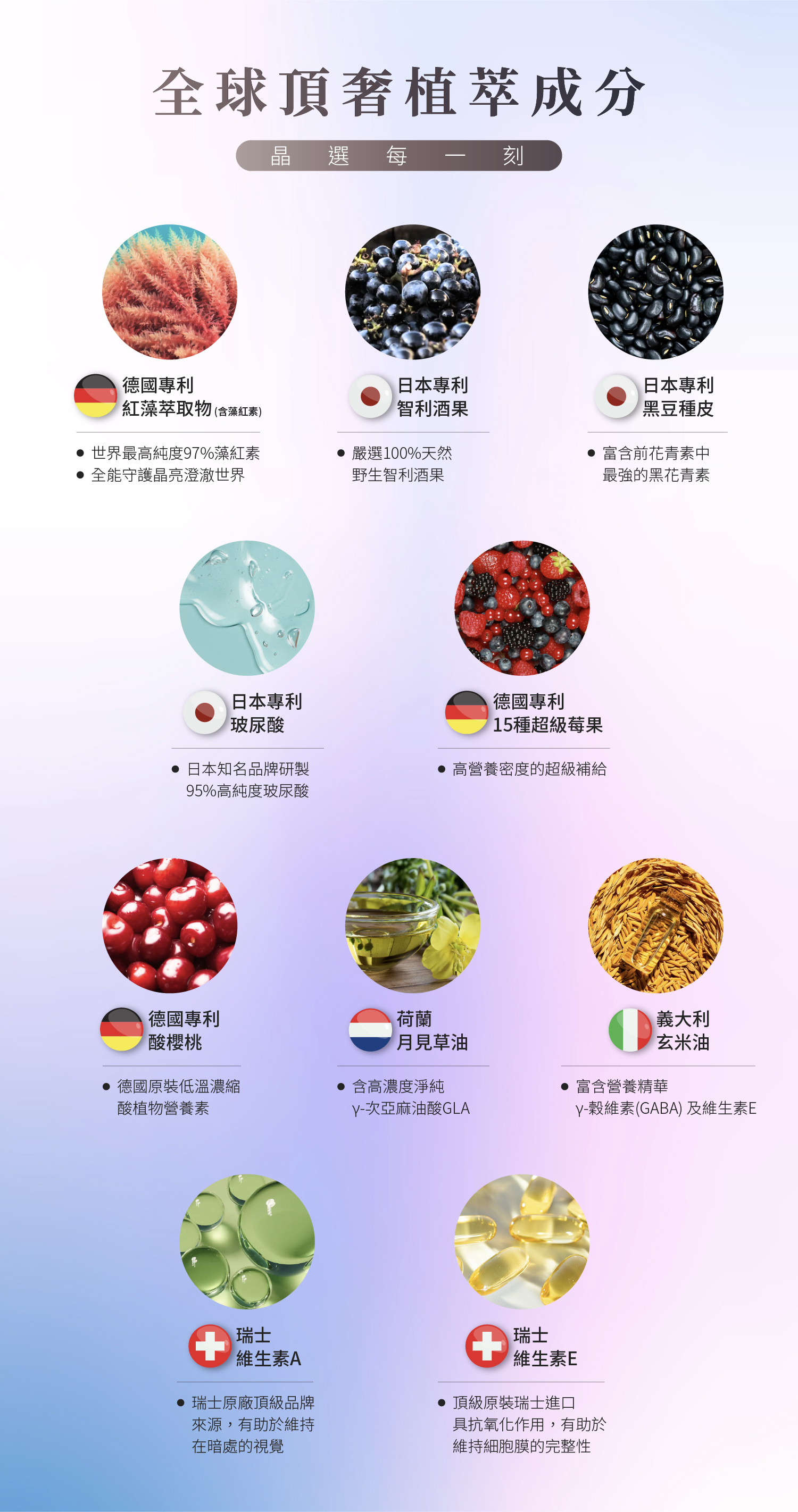 ▸ 嚴選多國專利高濃度珍貴植萃成分,全方位補給自然營養