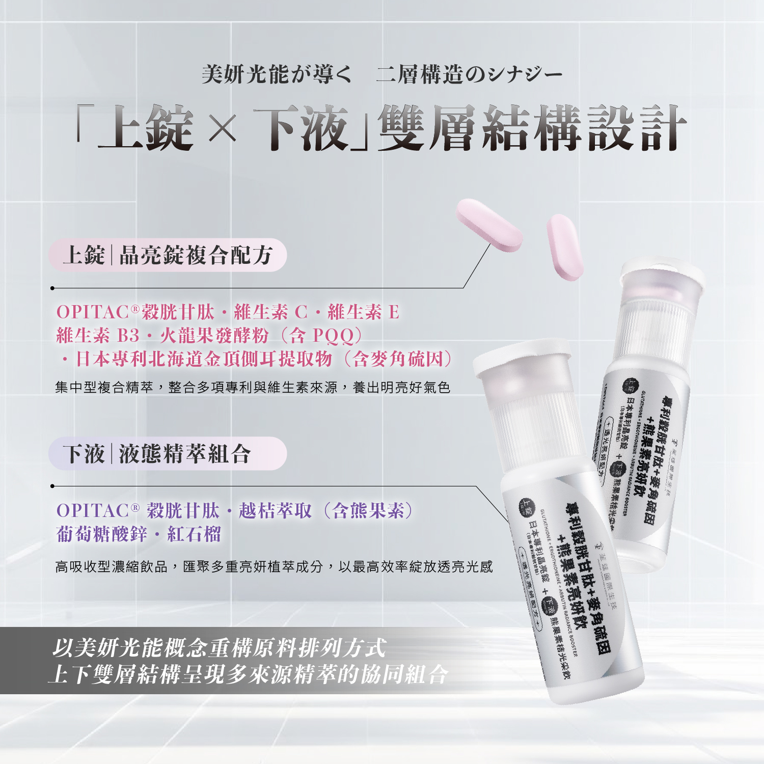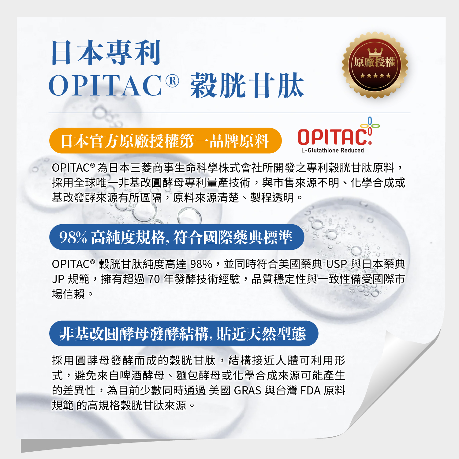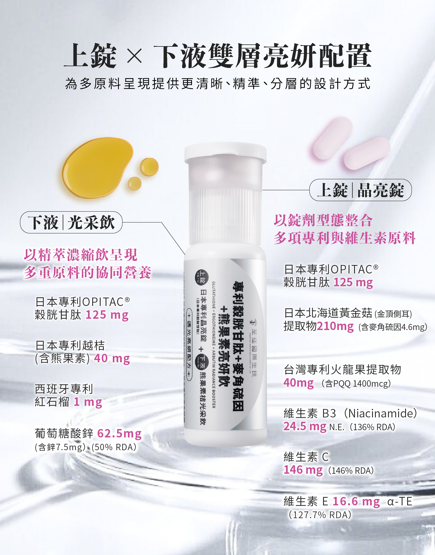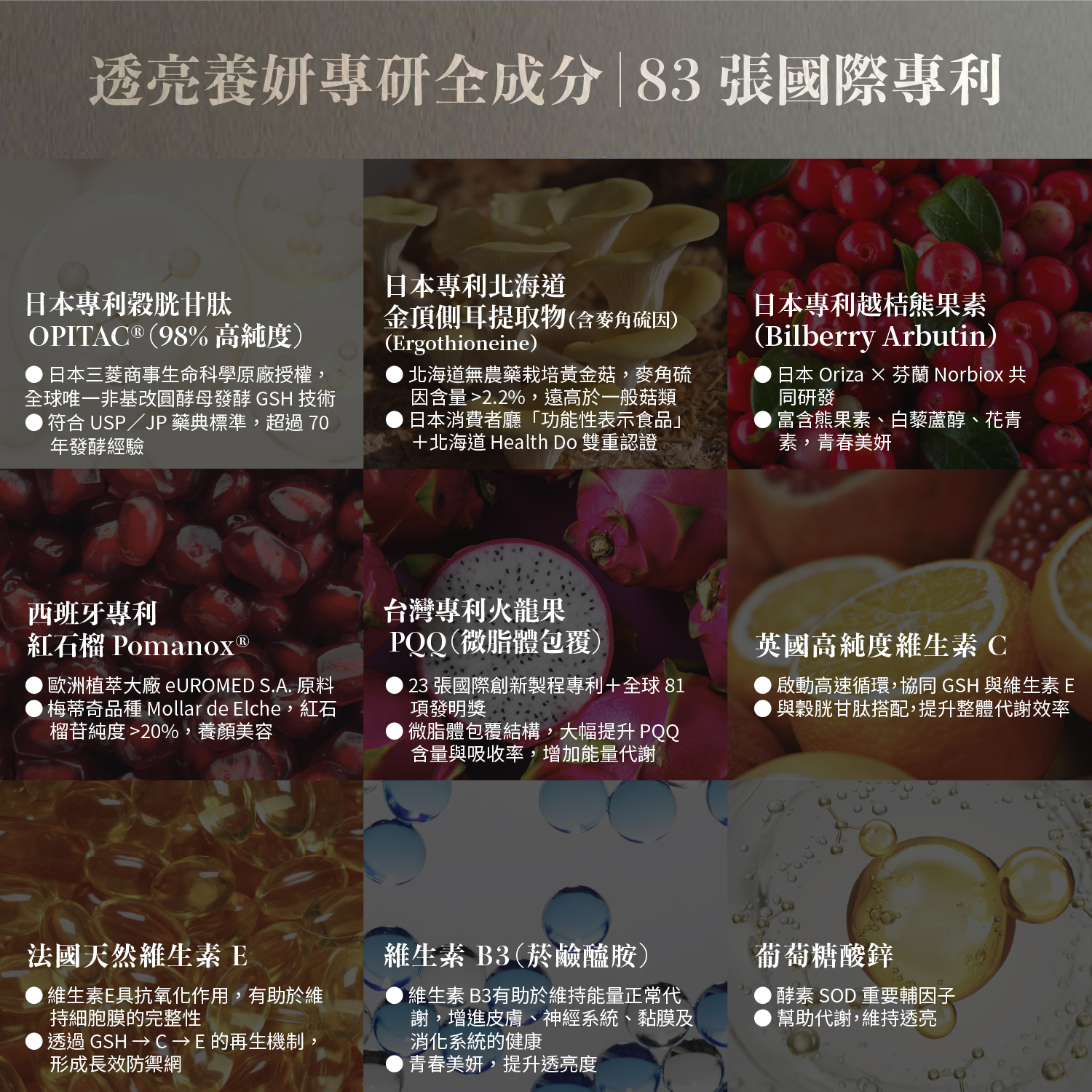 ▸ 獨家雙層導入結構:日本專利 OPITAC® 穀胱甘肽 250mg+日本專利北海道金頂側耳提取物(含麥角硫因) 4.6mg + 日本專利越桔熊果素40mg