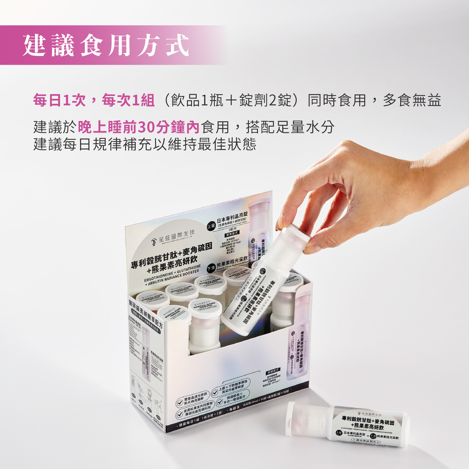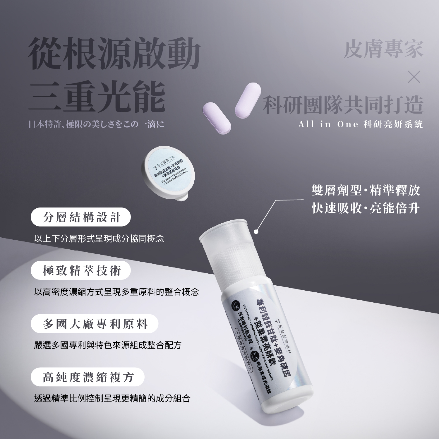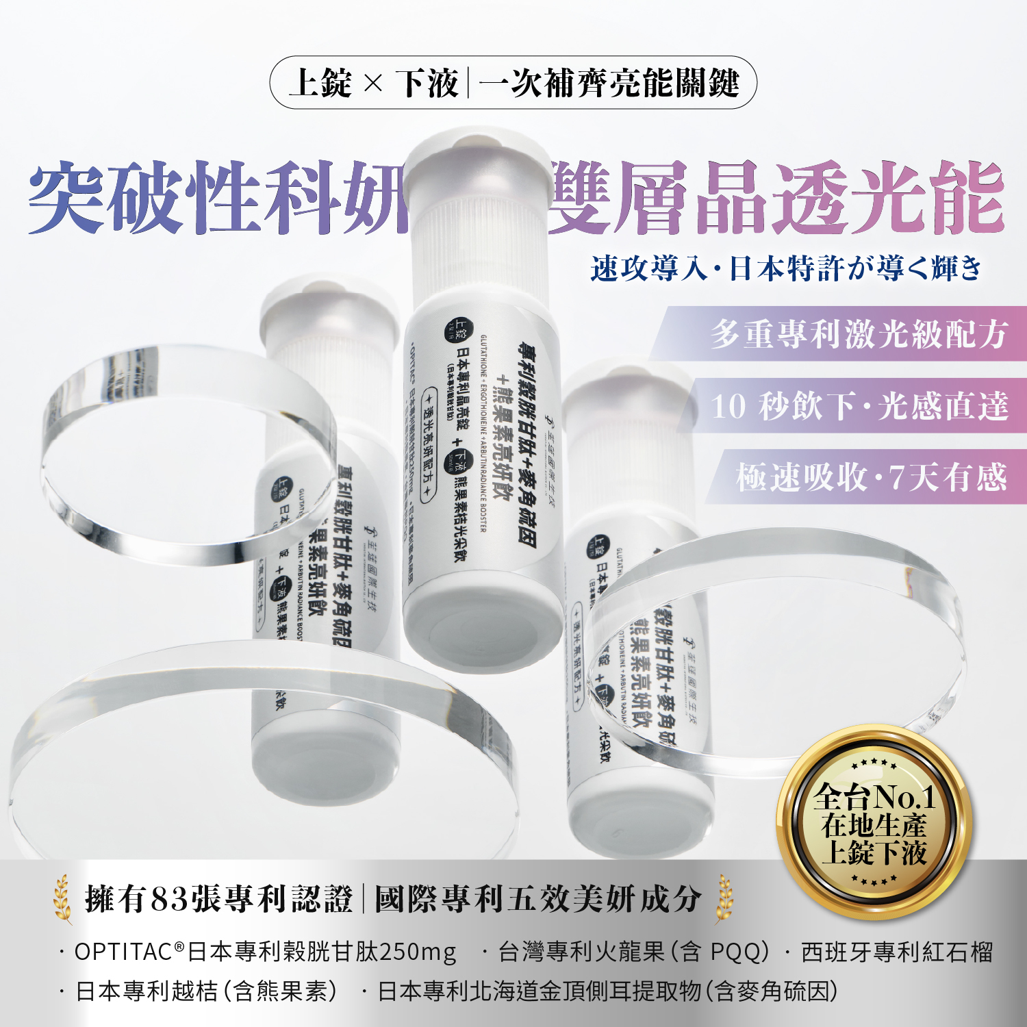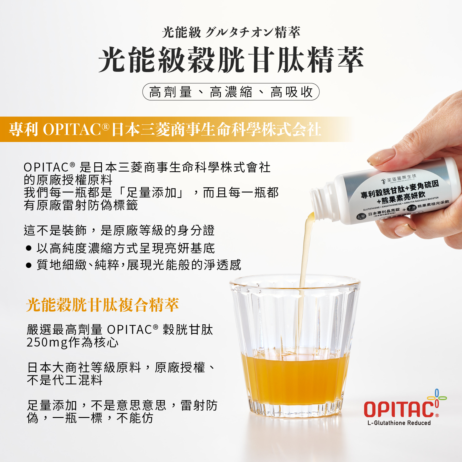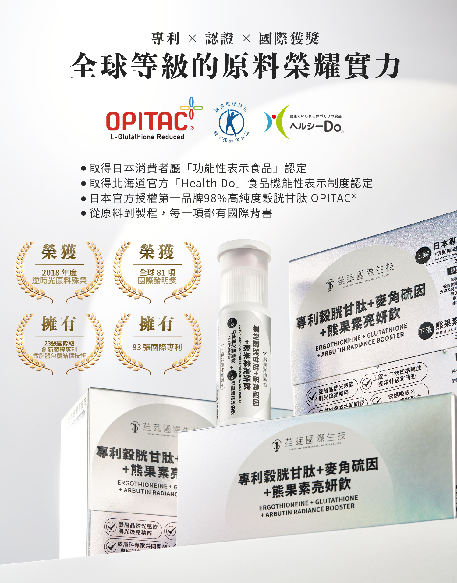 ▸ 獨家雙層導入結構:日本專利 OPITAC® 穀胱甘肽 250mg+日本專利北海道金頂側耳提取物(含麥角硫因) 4.6mg + 日本專利越桔熊果素40mg