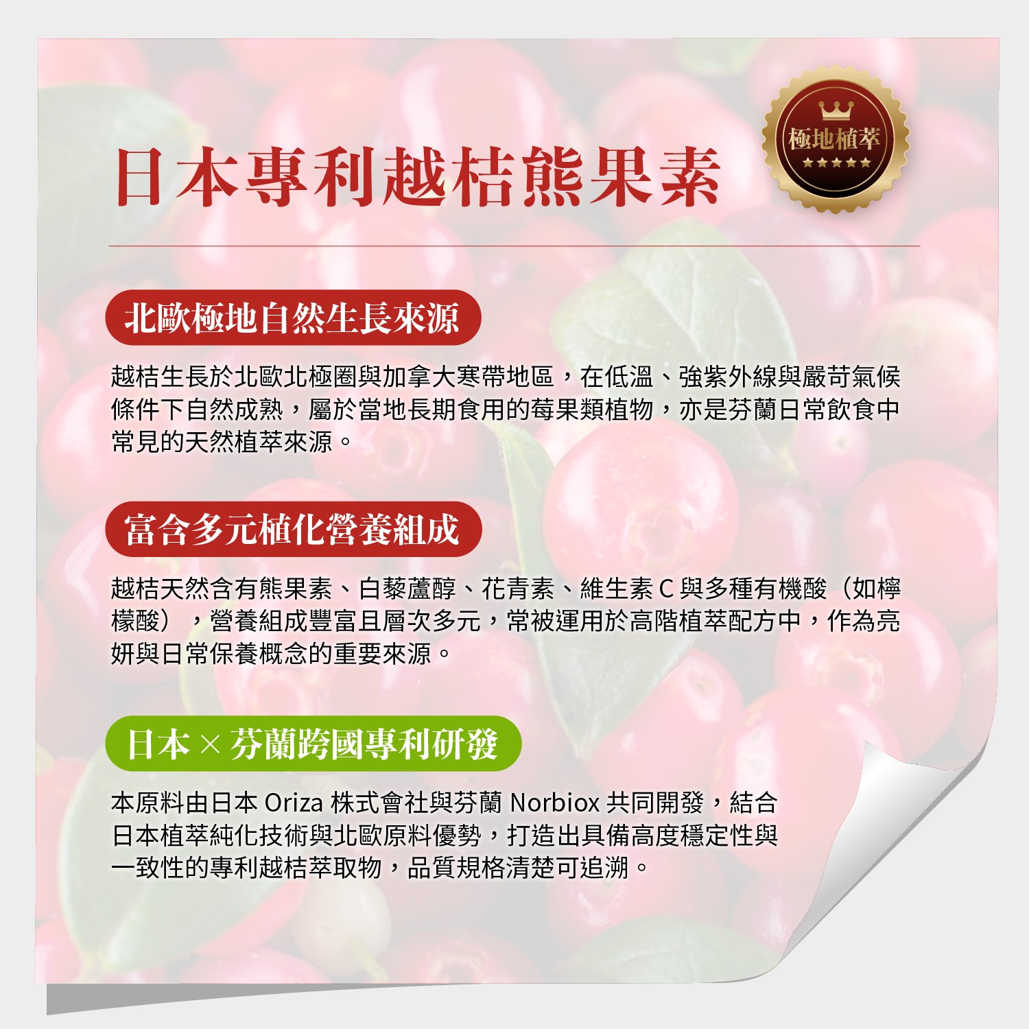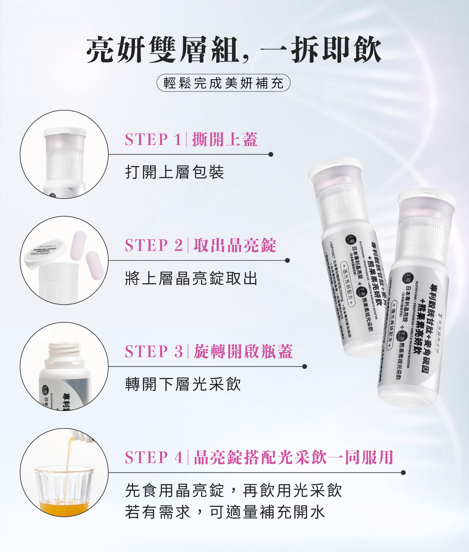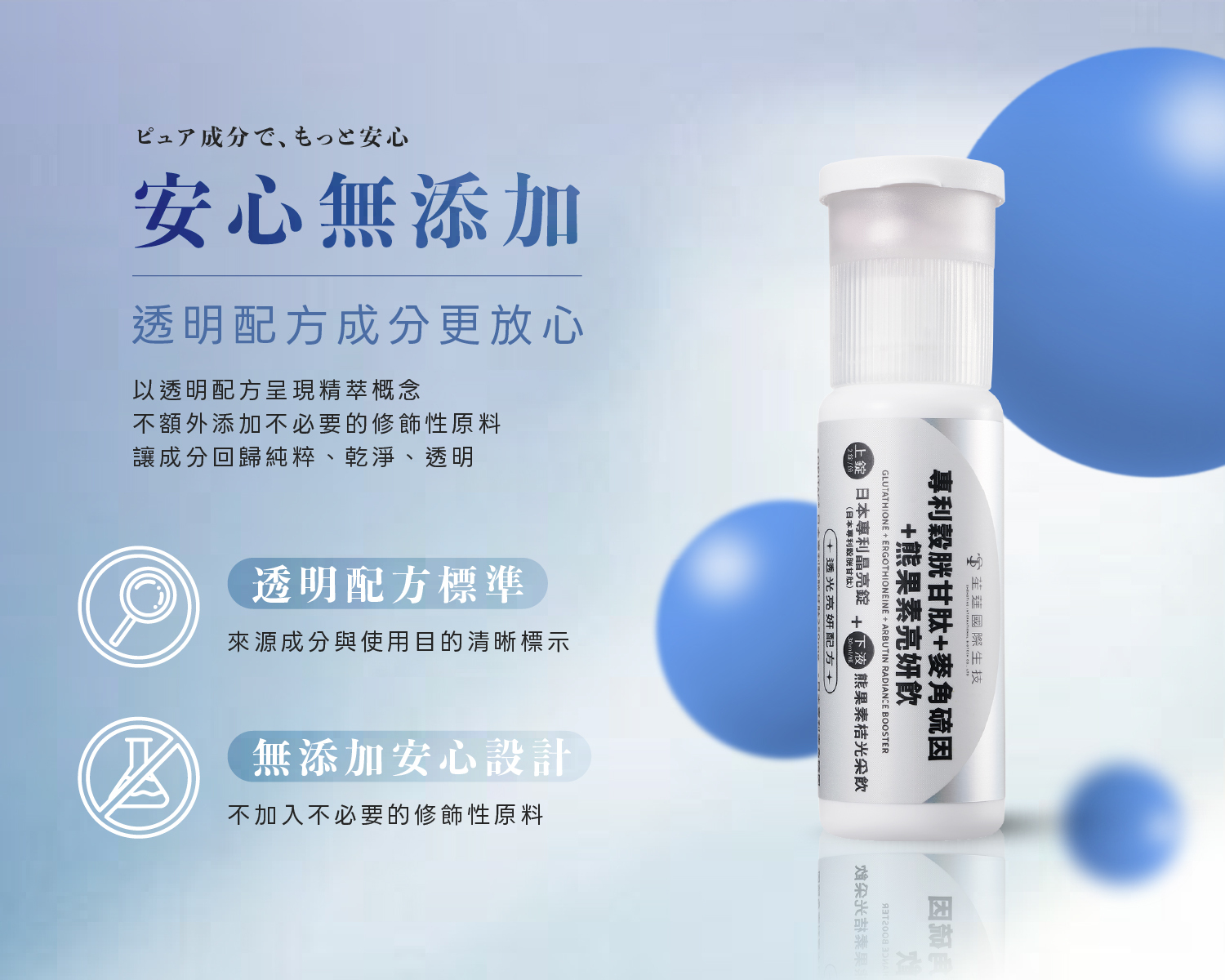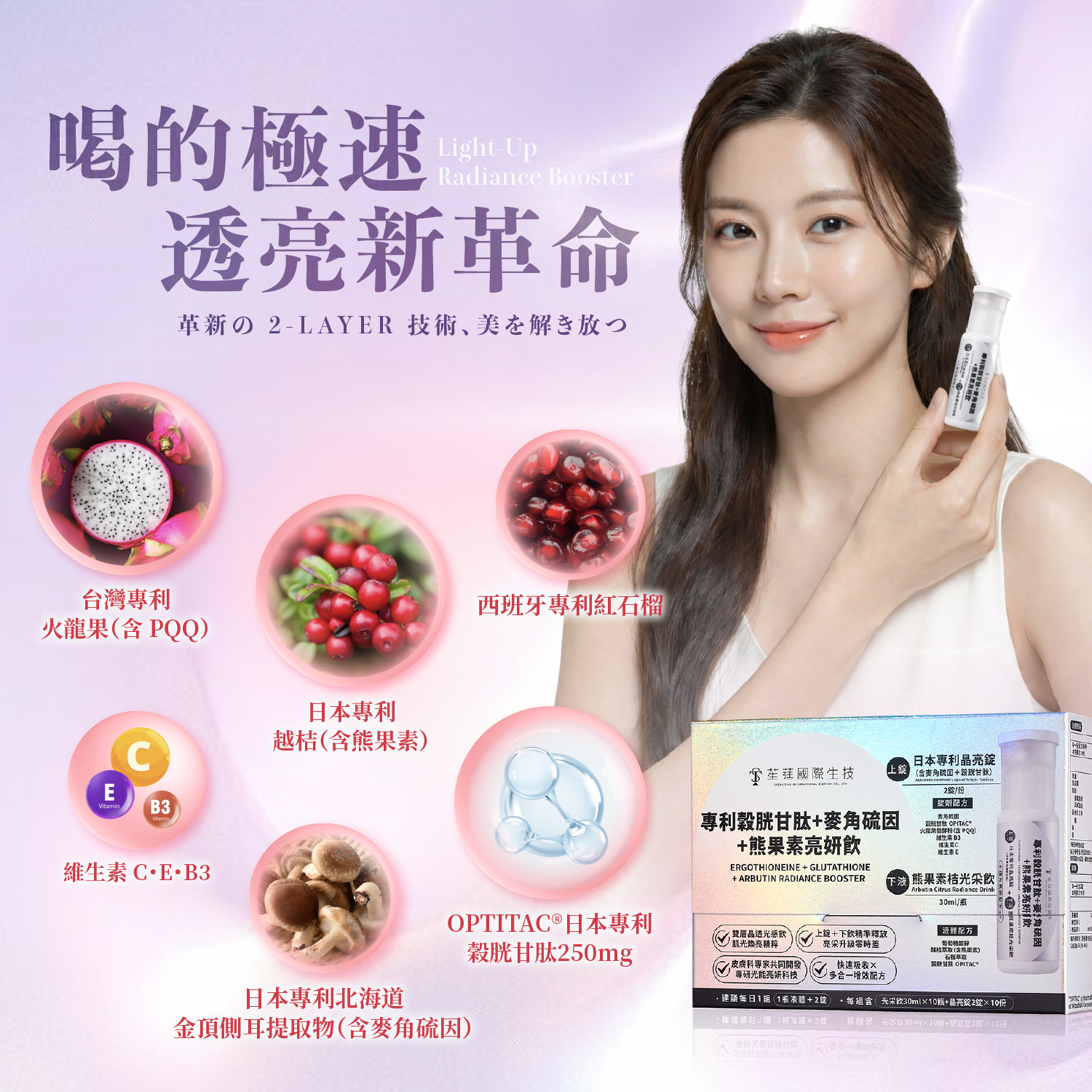 ▸ 獨家雙層導入結構:日本專利 OPITAC® 穀胱甘肽 250mg+日本專利北海道金頂側耳提取物(含麥角硫因) 4.6mg + 日本專利越桔熊果素40mg