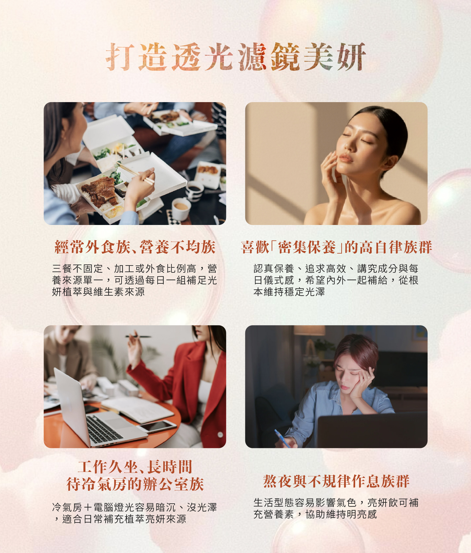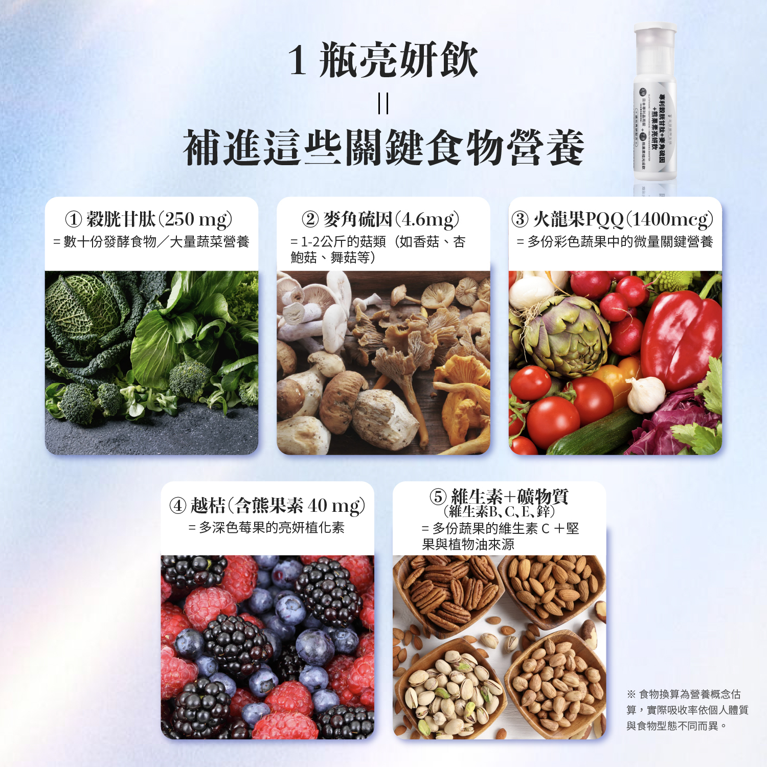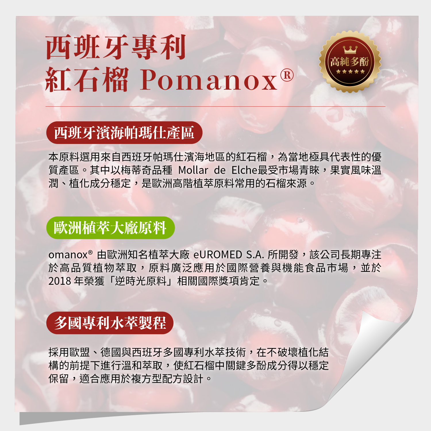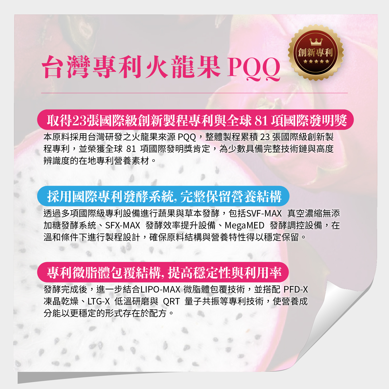 ▸ 專利加乘協同配方:台灣專利火龍果 PQQ + 西班牙專利紅石榴 + 維生素B3、C、E