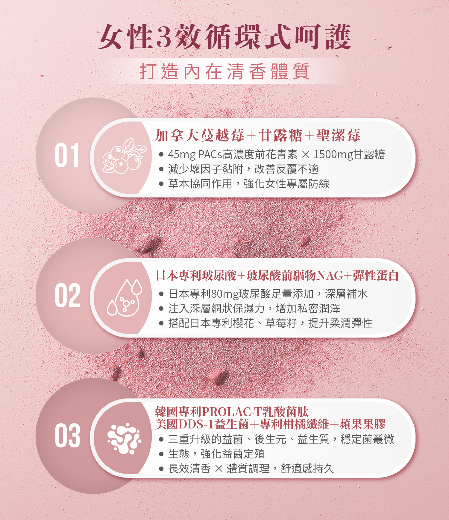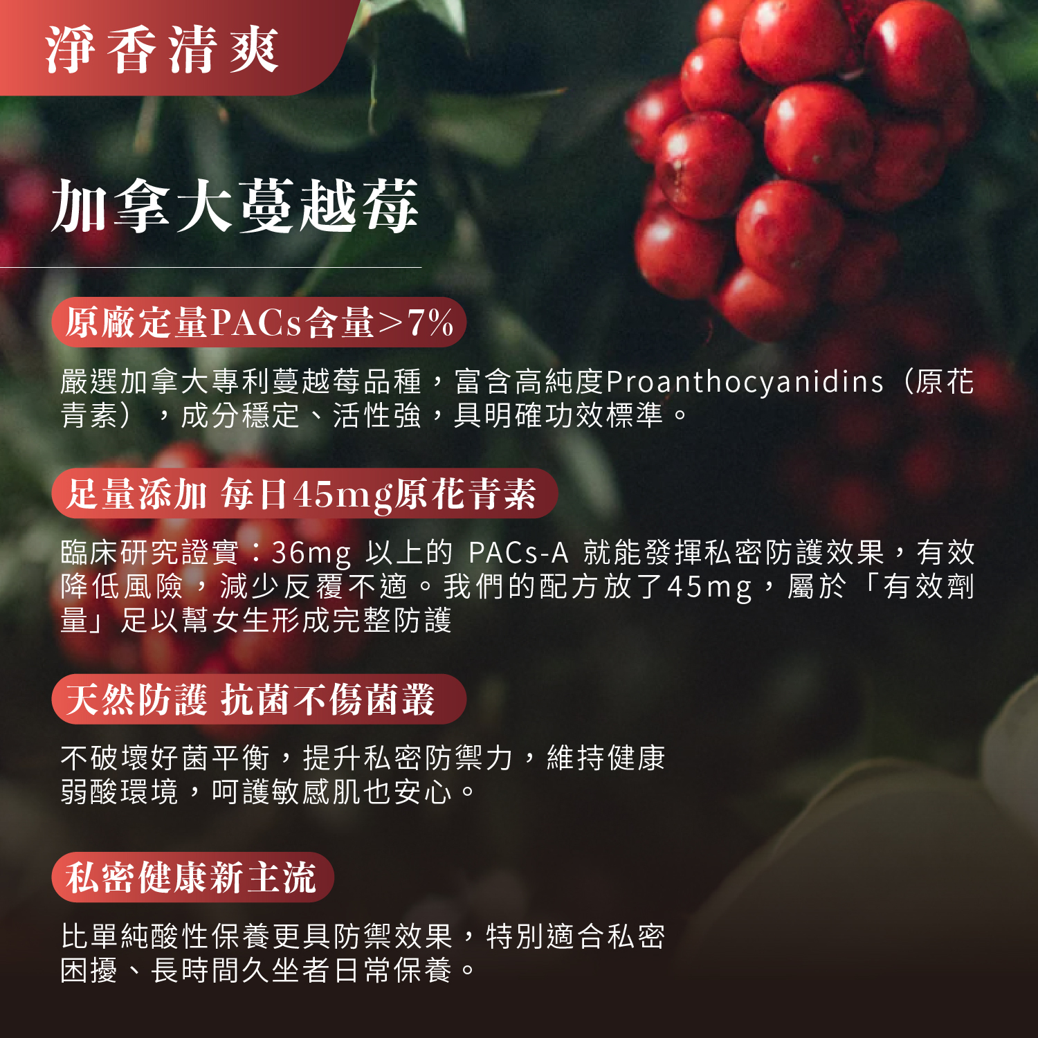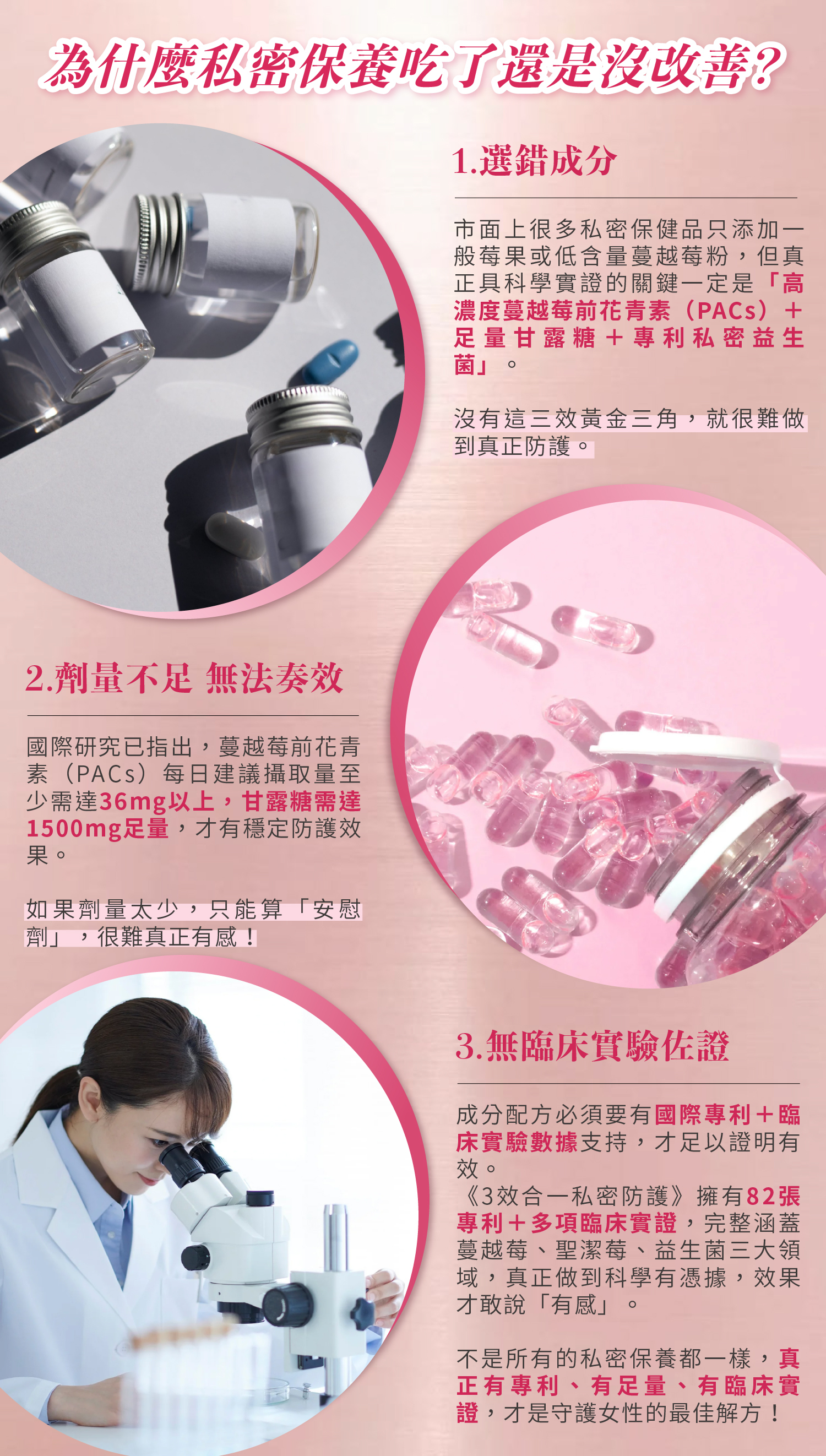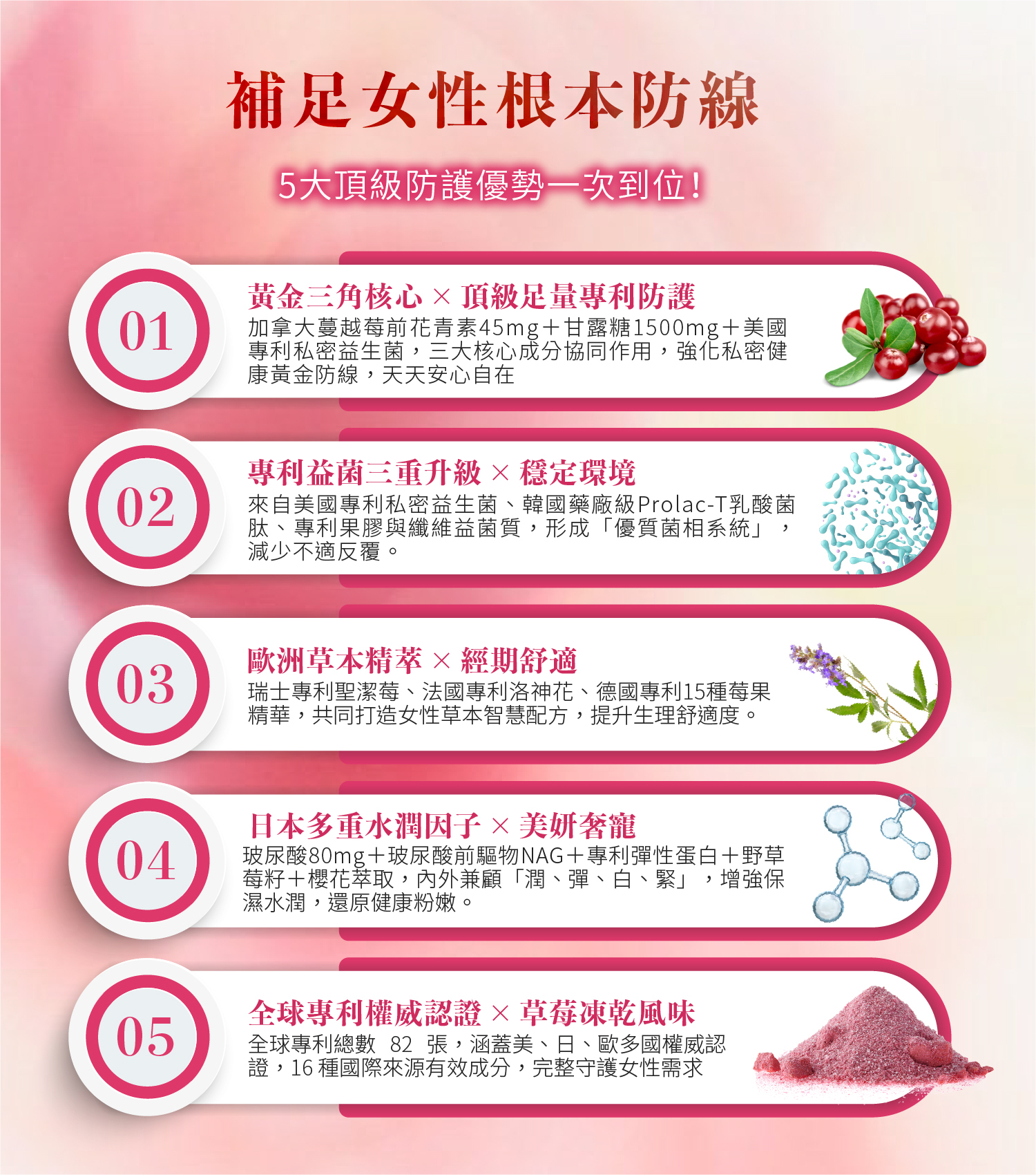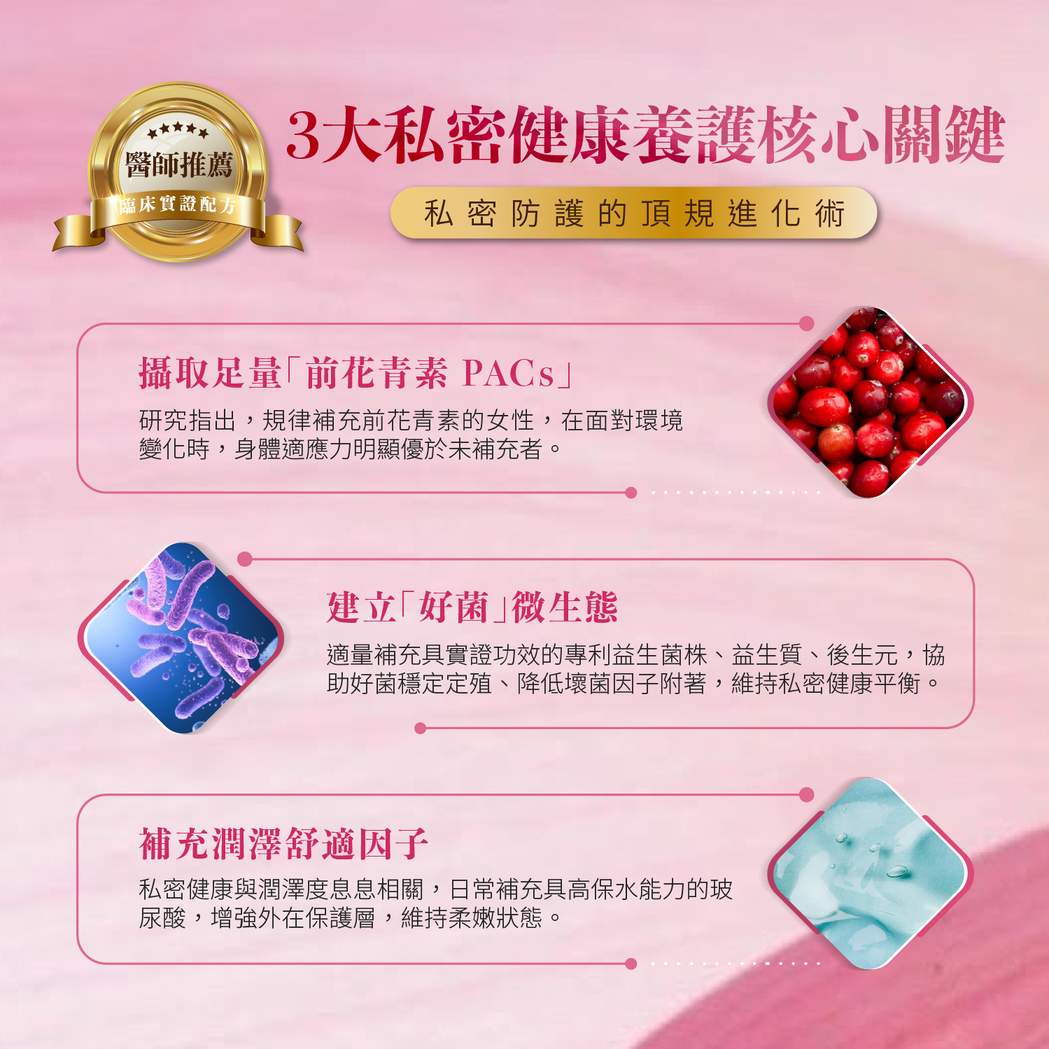 ▸ 臨床實證關鍵劑量:蔓越莓前花青素 45mg+甘露糖 1500mg+日本專利玻尿酸 80mg,淨馨清爽保水,效果有感不反覆