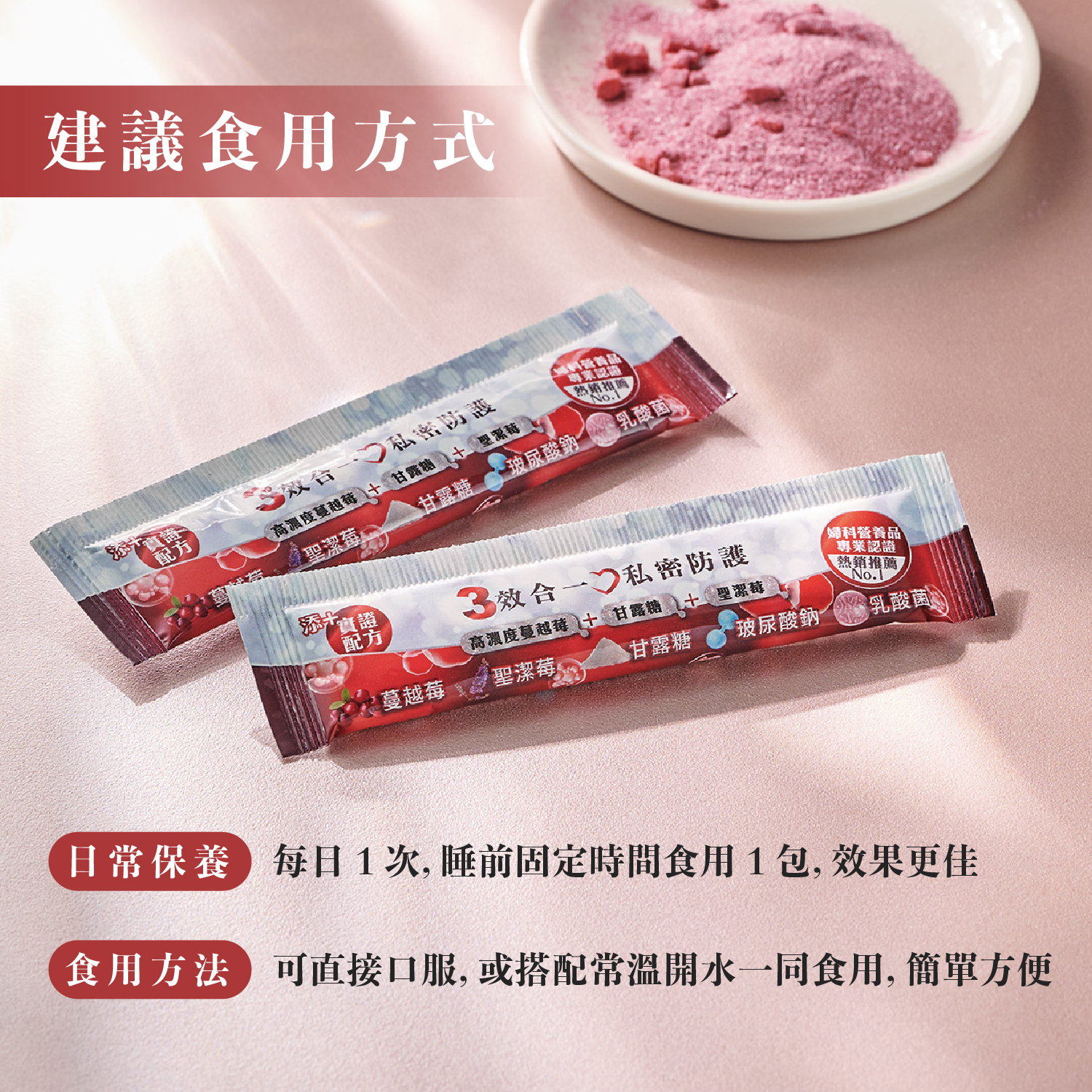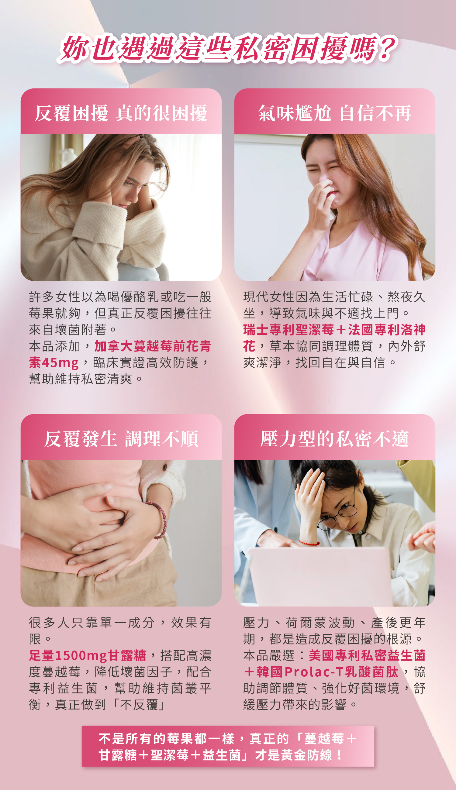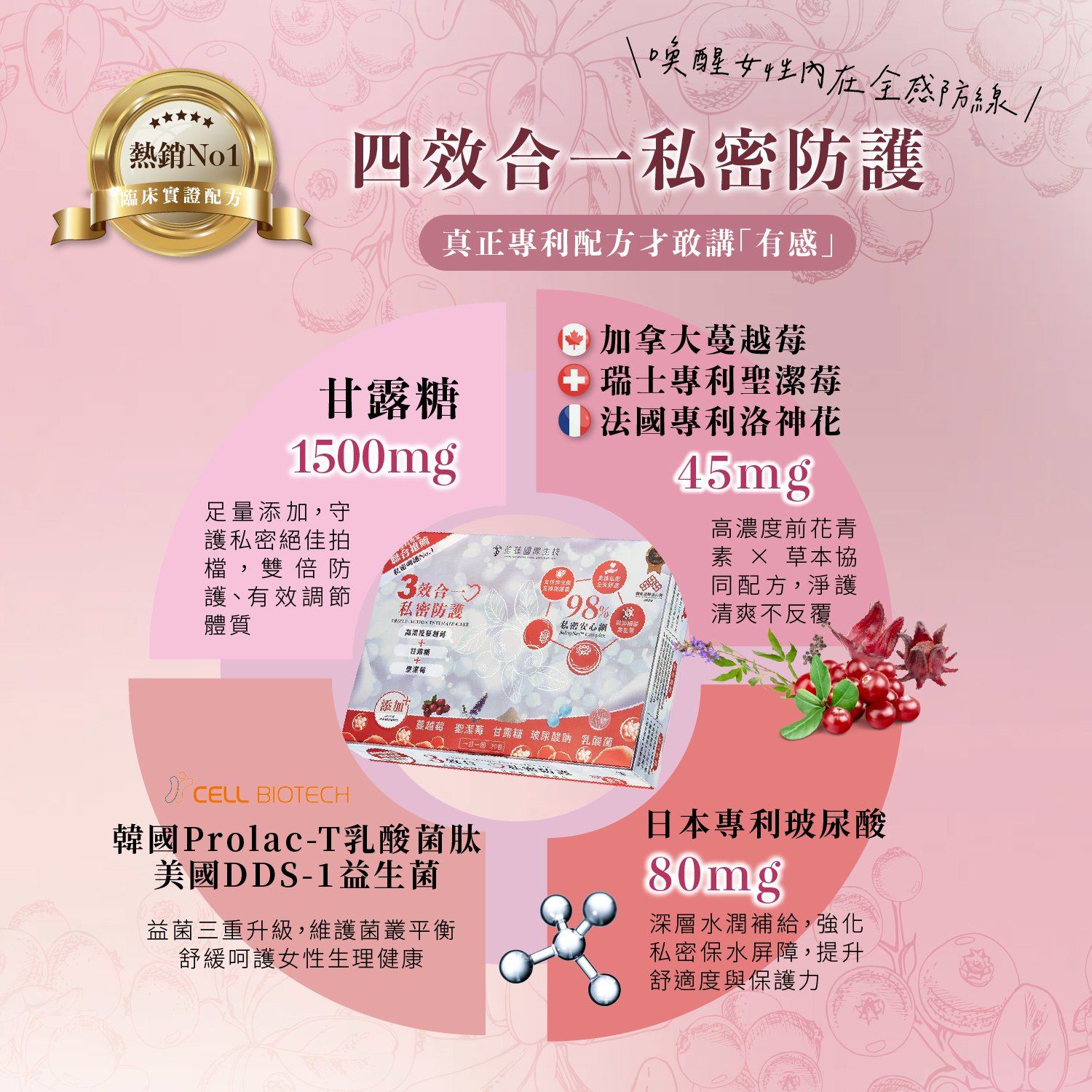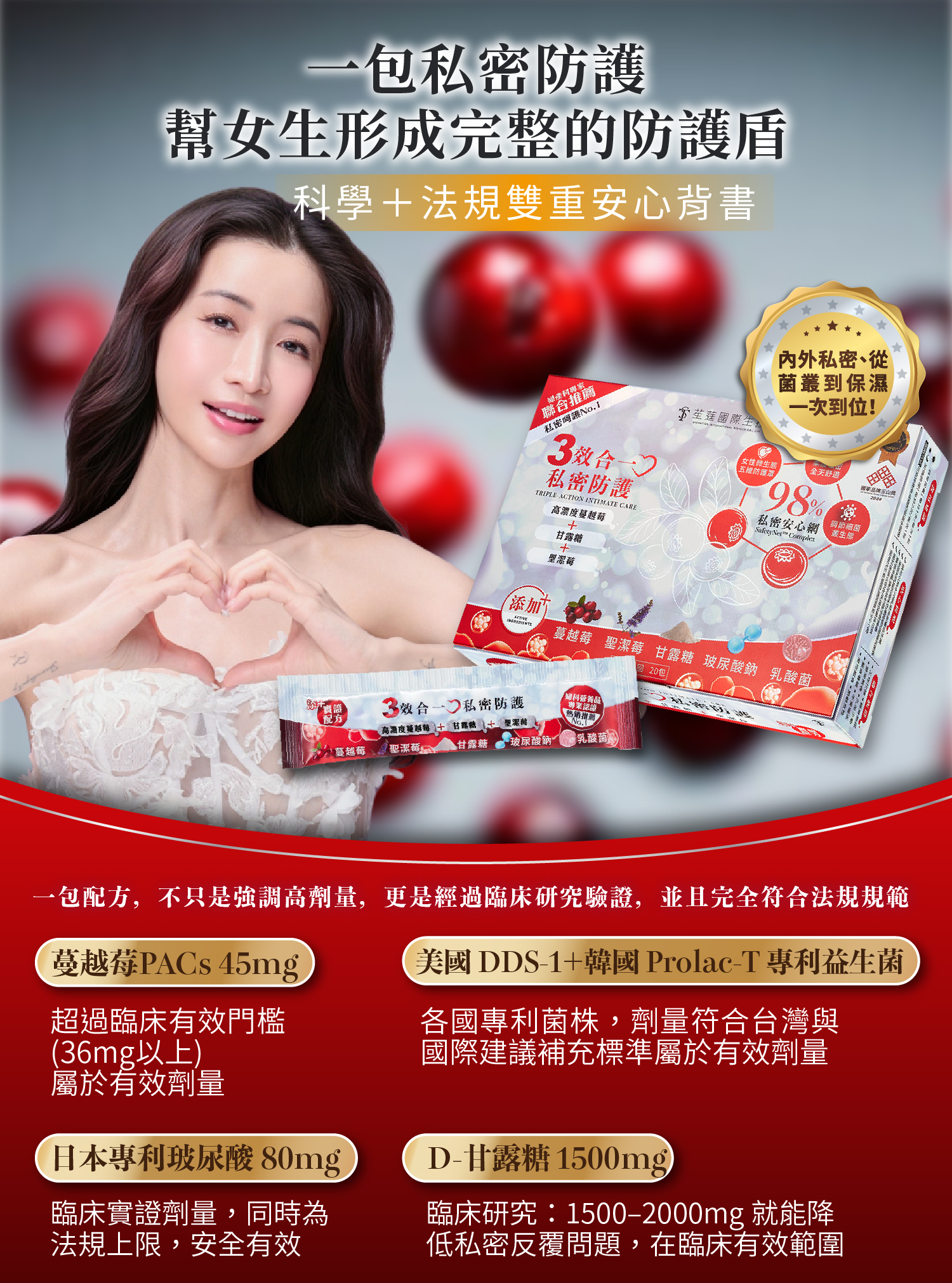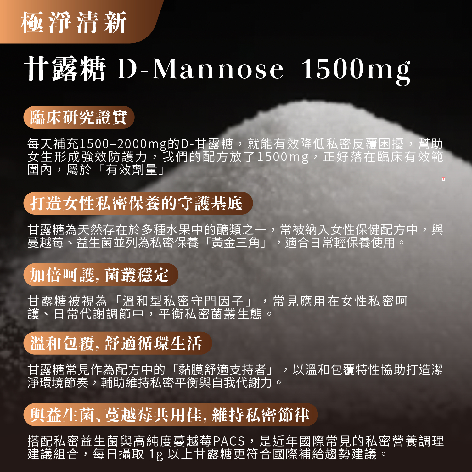▸ 臨床實證關鍵劑量:蔓越莓前花青素 45mg+甘露糖 1500mg+日本專利玻尿酸 80mg,淨馨清爽保水,效果有感不反覆