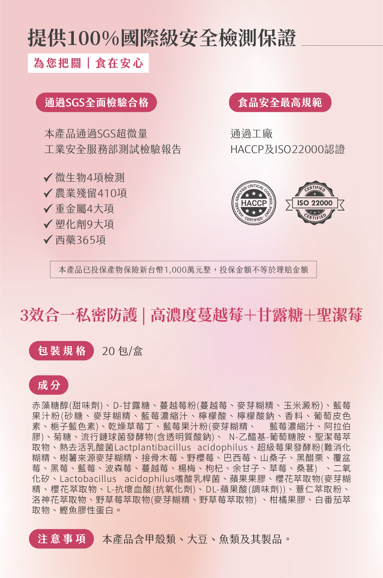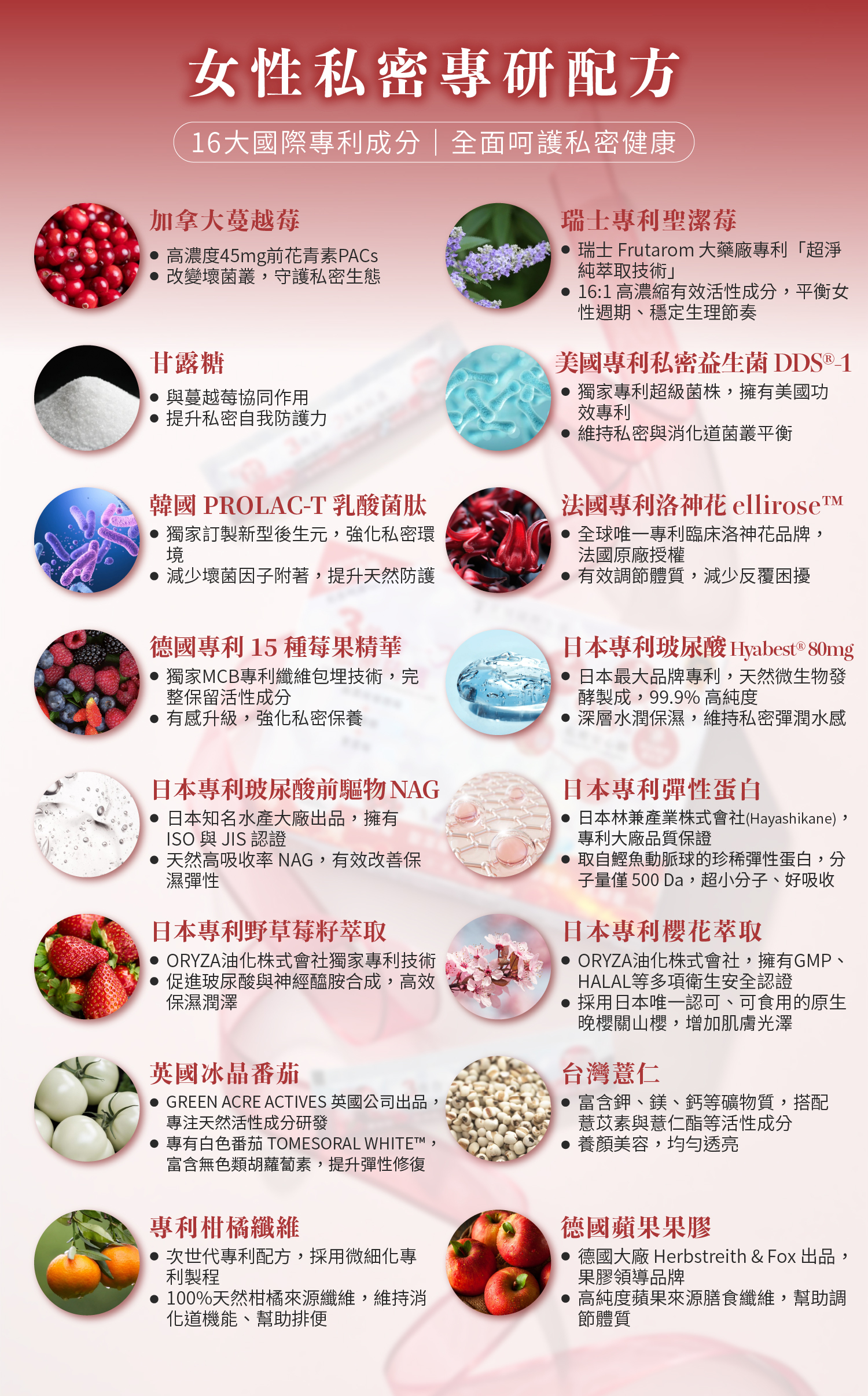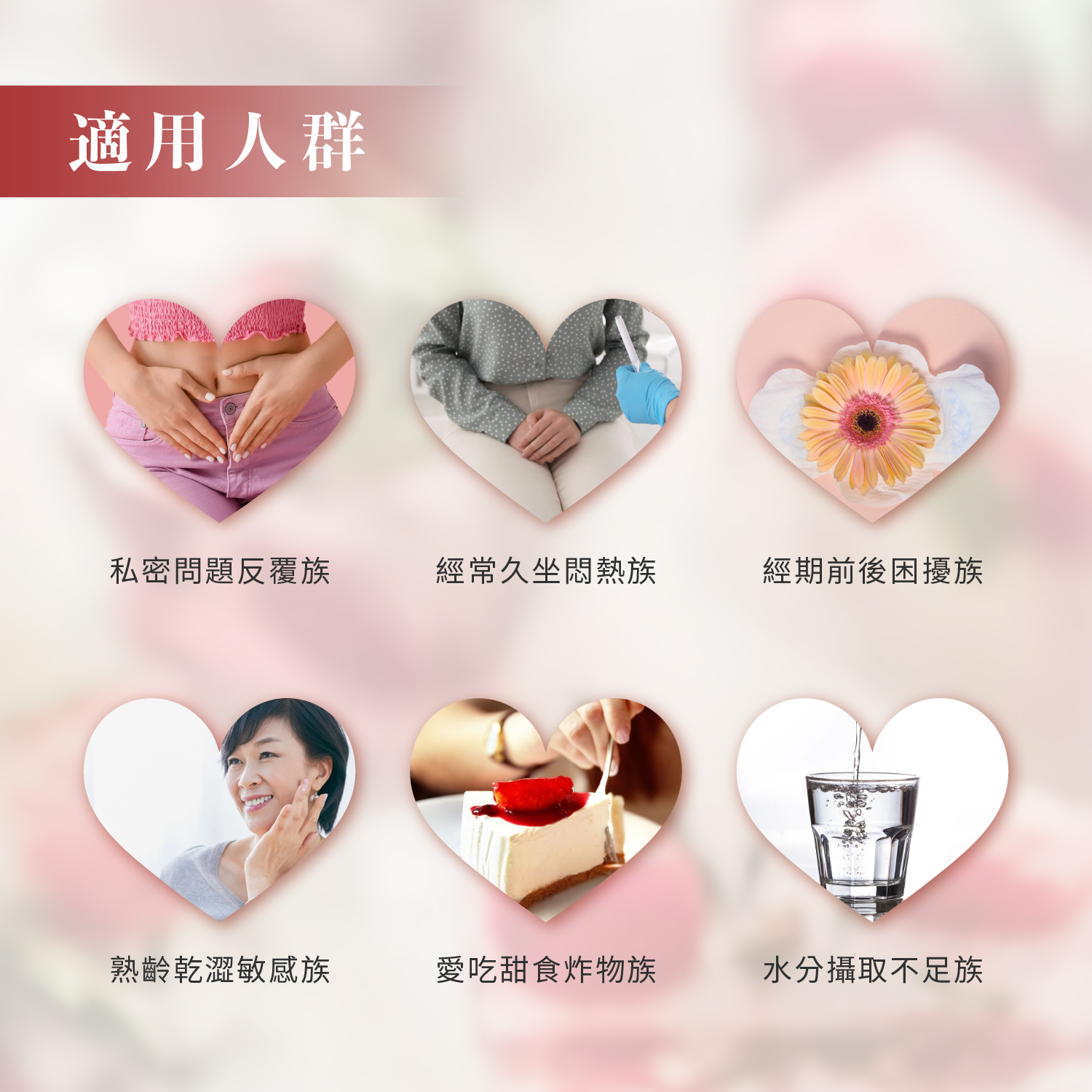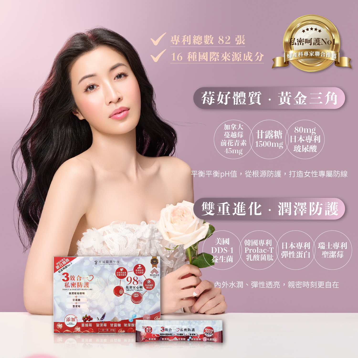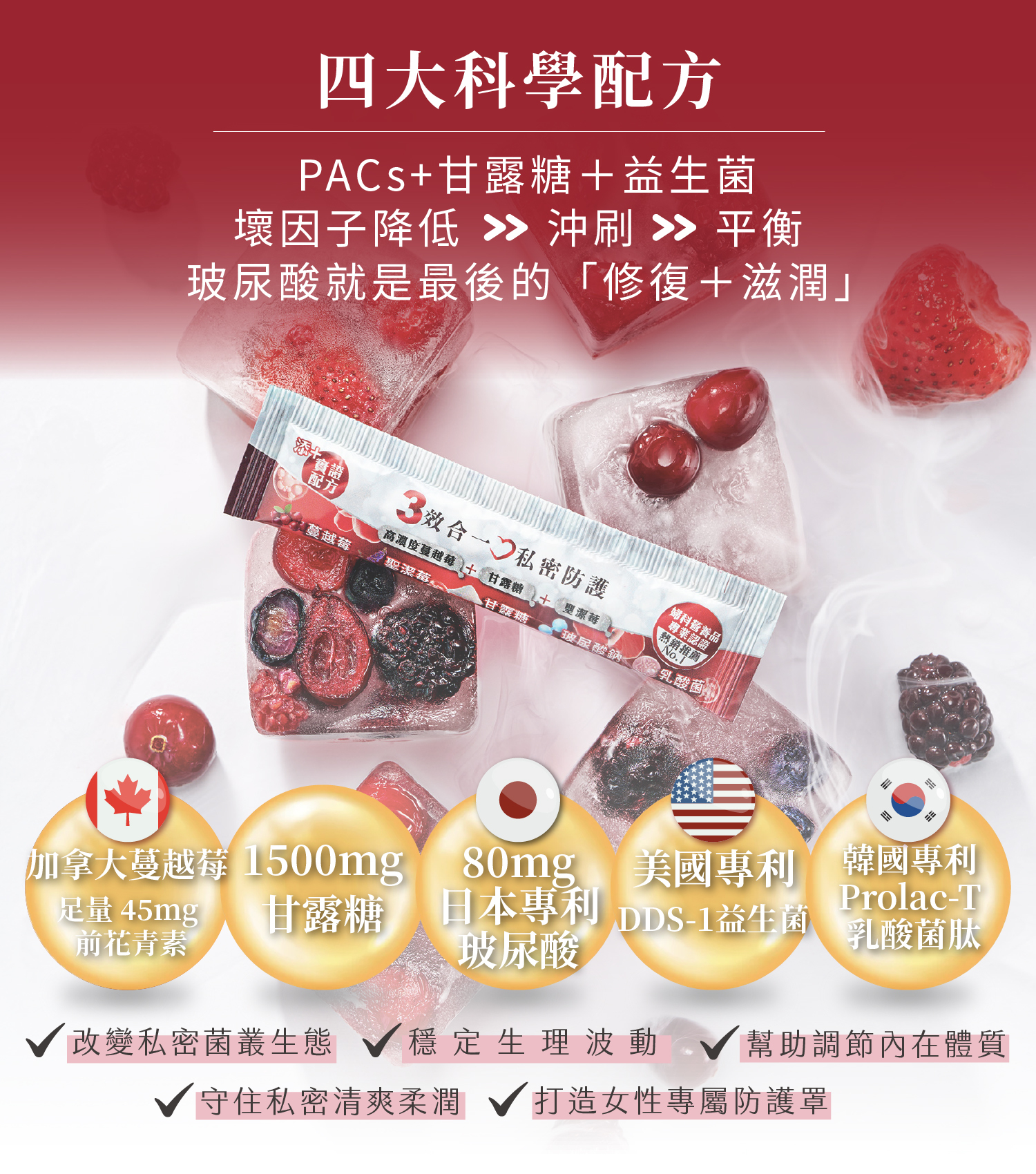 ▸ 臨床實證關鍵劑量:蔓越莓前花青素 45mg+甘露糖 1500mg+日本專利玻尿酸 80mg,淨馨清爽保水,效果有感不反覆
