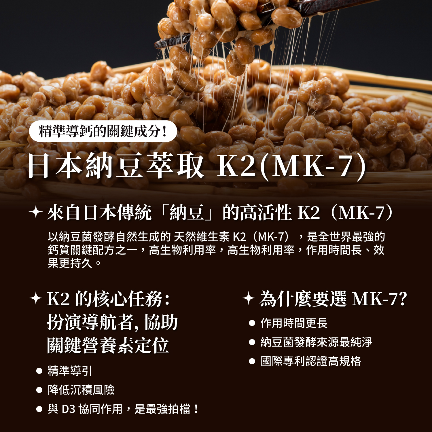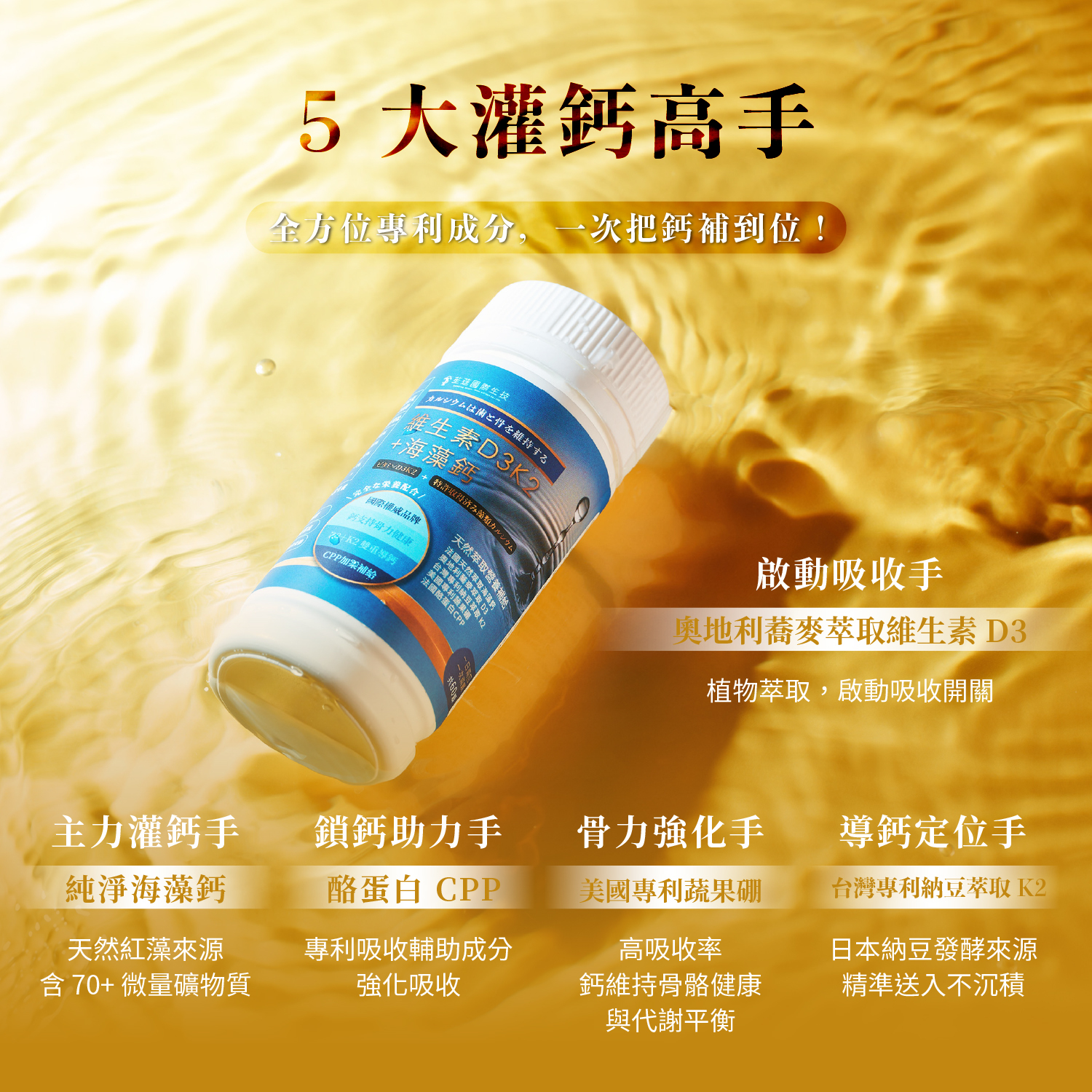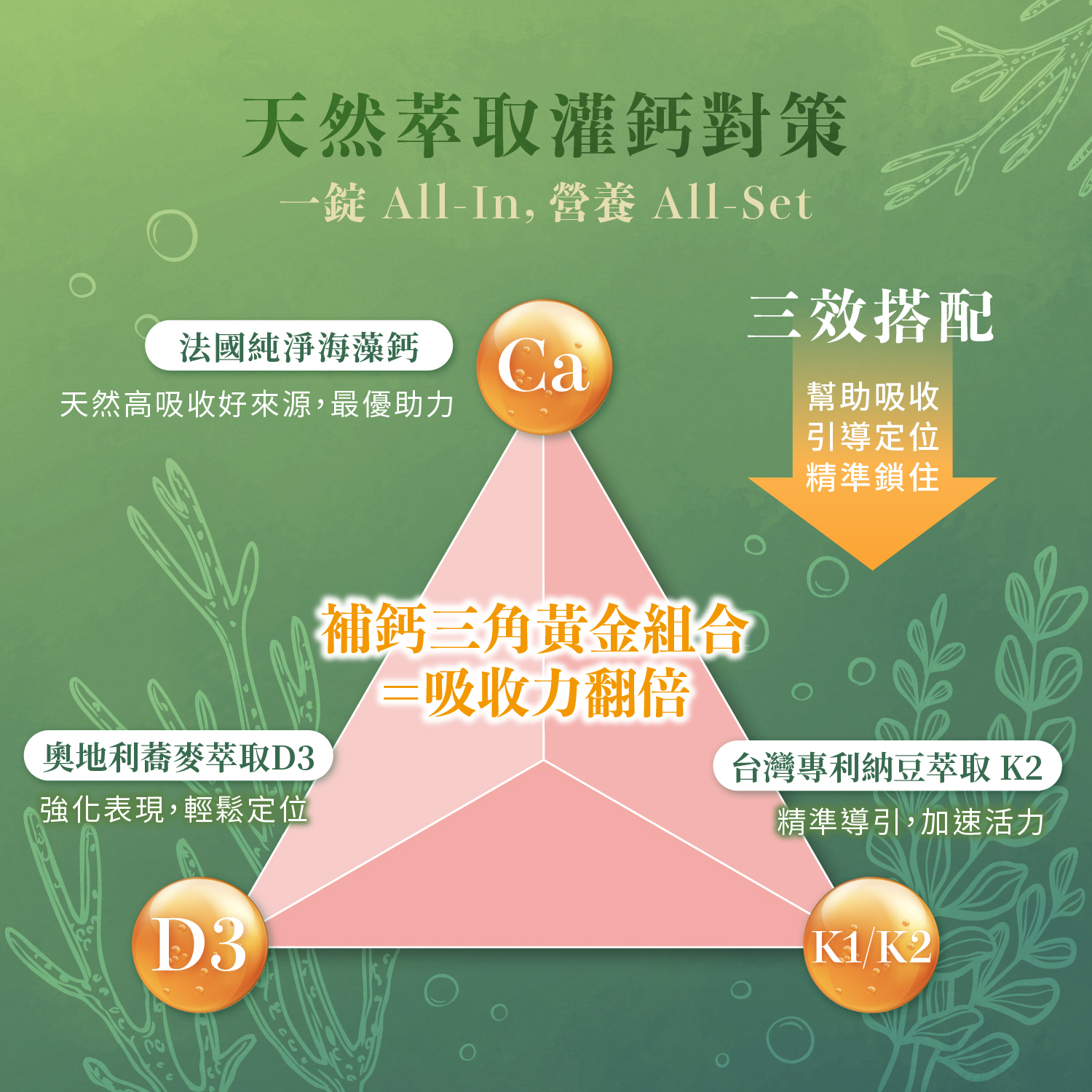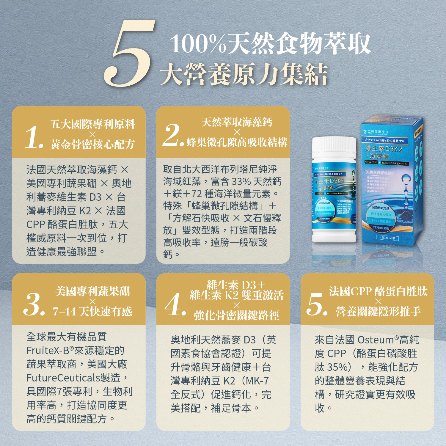 ▸ 100% 天然食物萃取:法國天然海藻鈣 500 mg+奧地利蕎麥維生素 D3 400 IU+台灣專利納豆維生素 K2(MK-7)120 μg