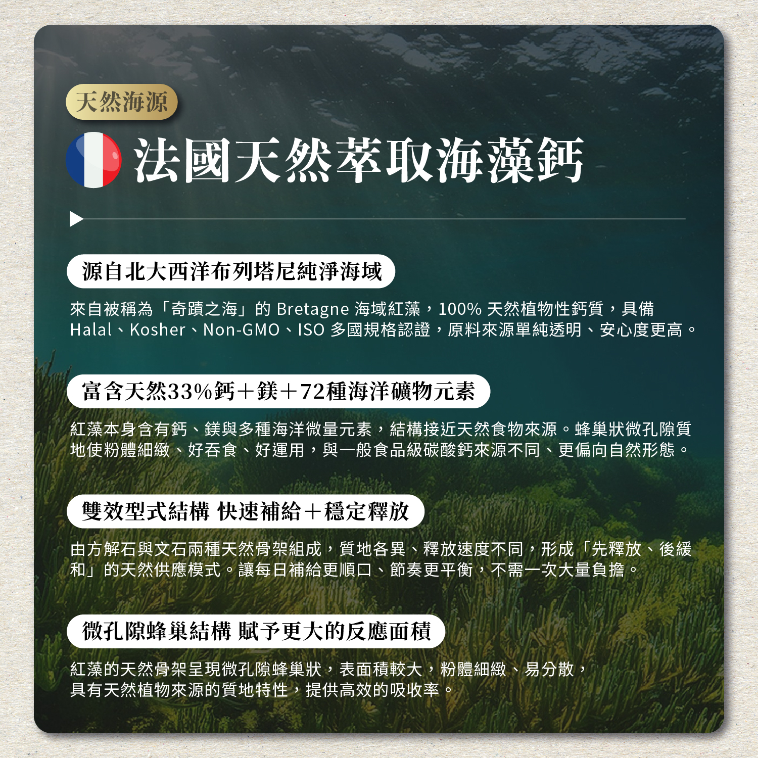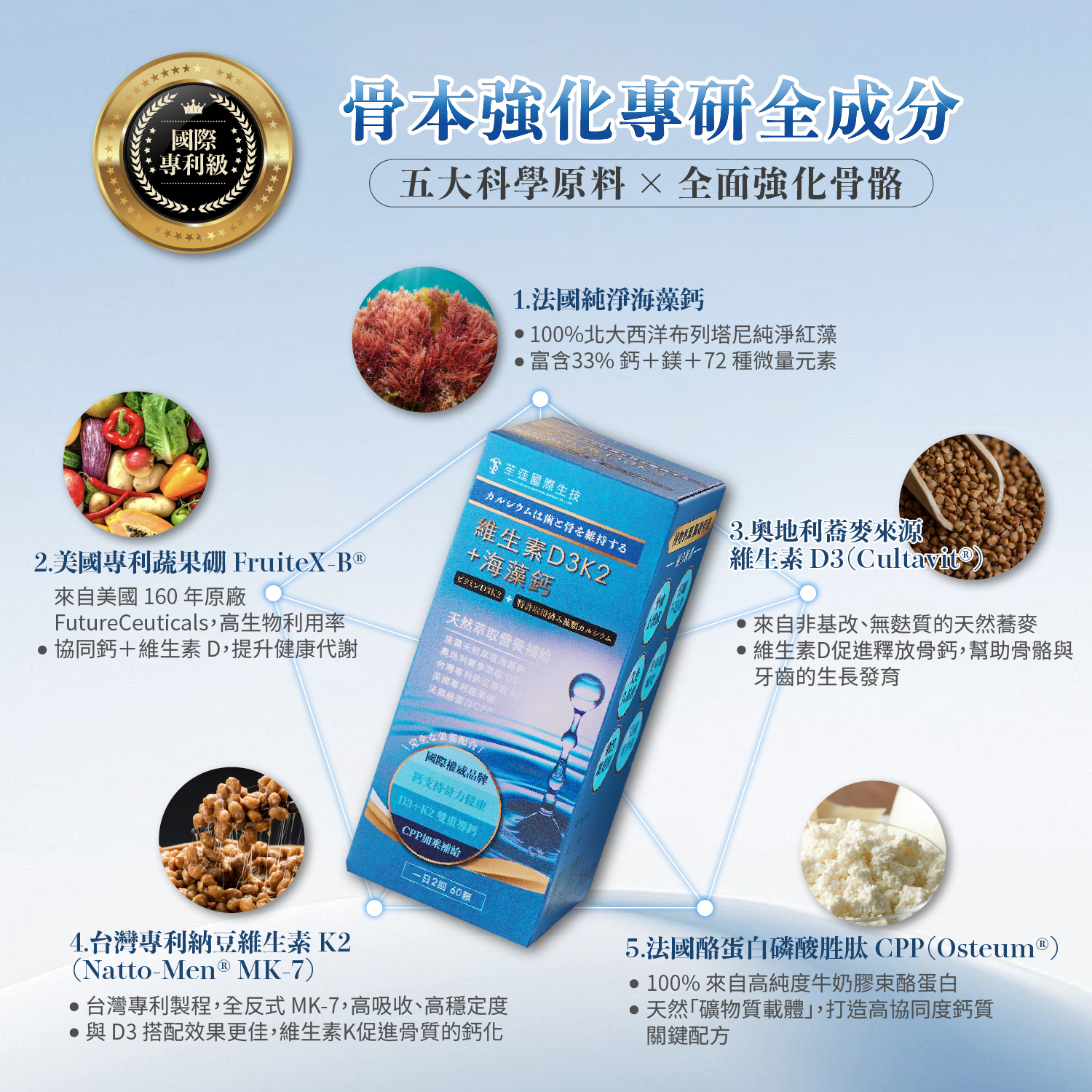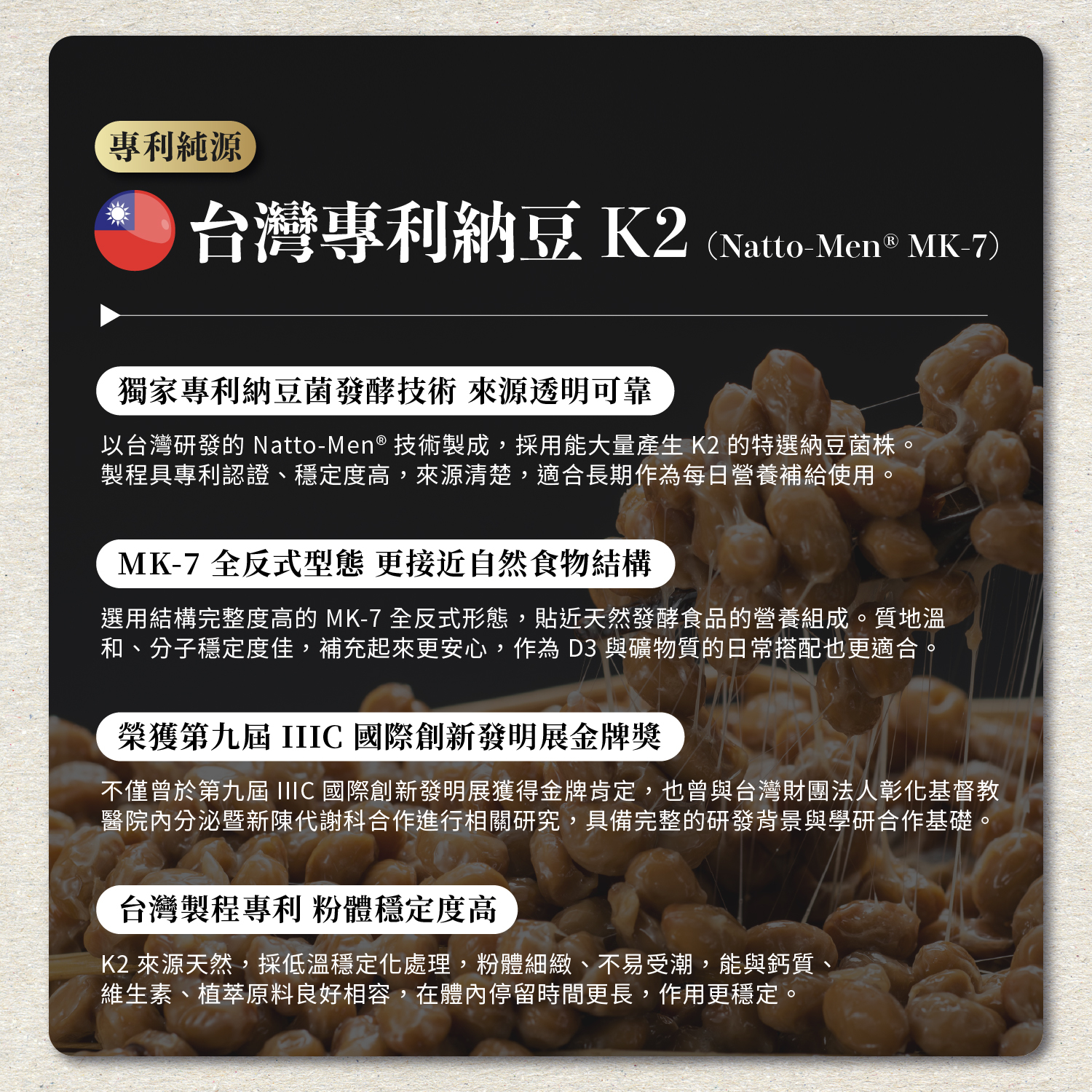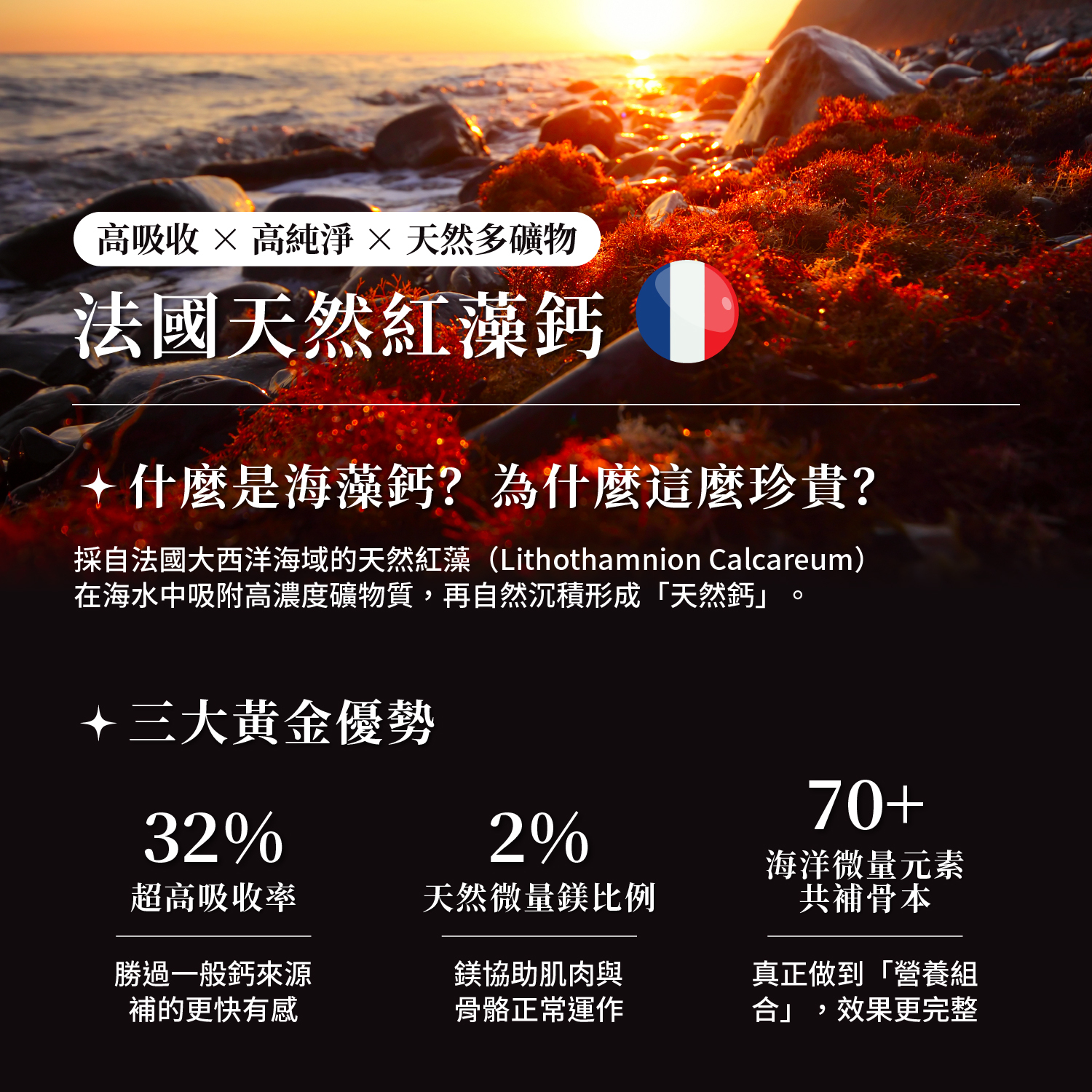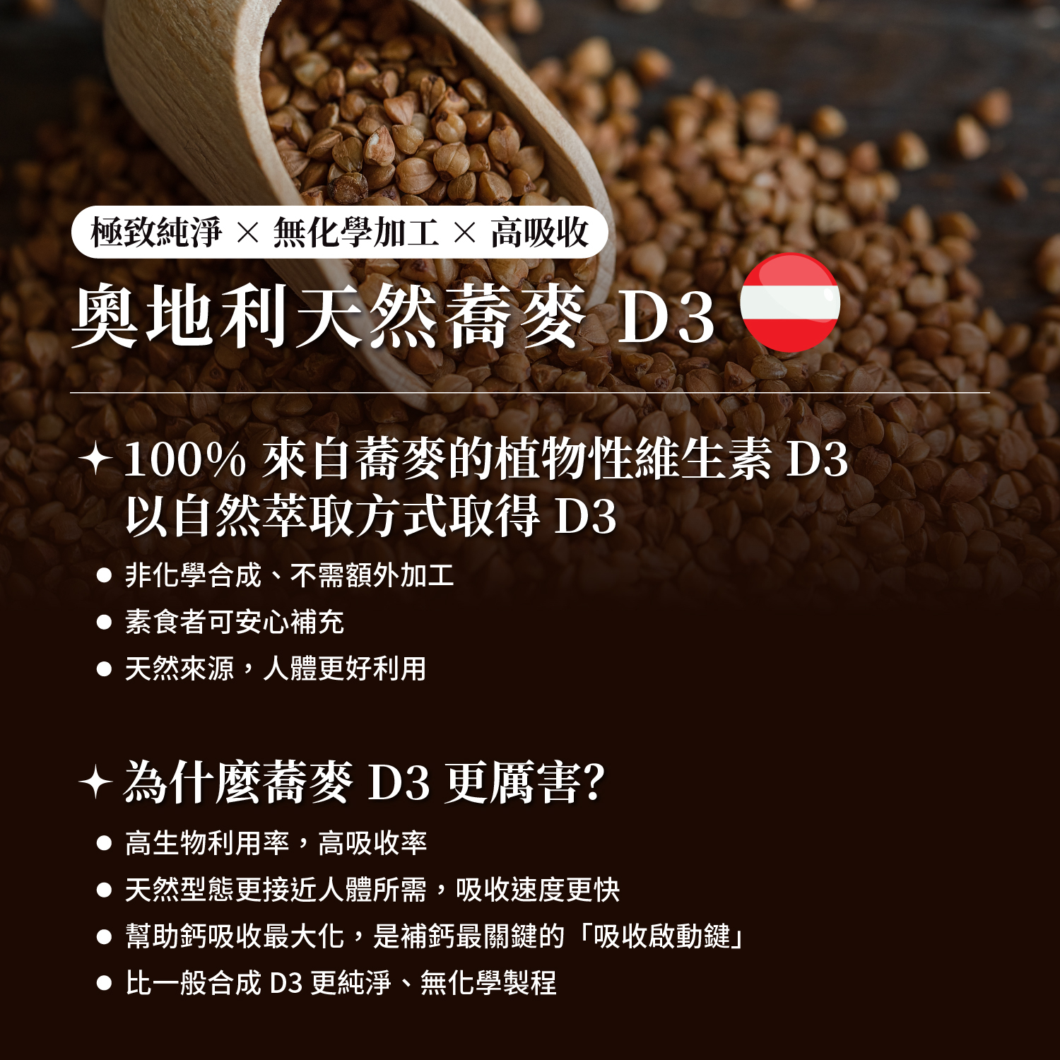 ▸ 100% 天然食物萃取:法國天然海藻鈣 500 mg+奧地利蕎麥維生素 D3 400 IU+台灣專利納豆維生素 K2(MK-7)120 μg