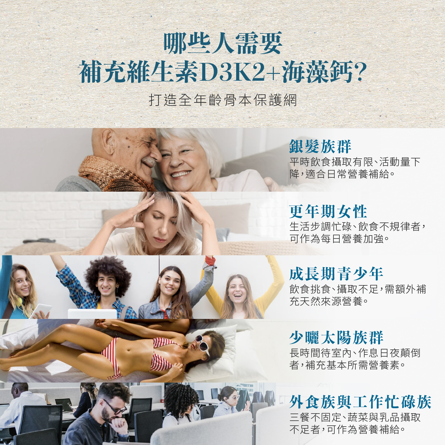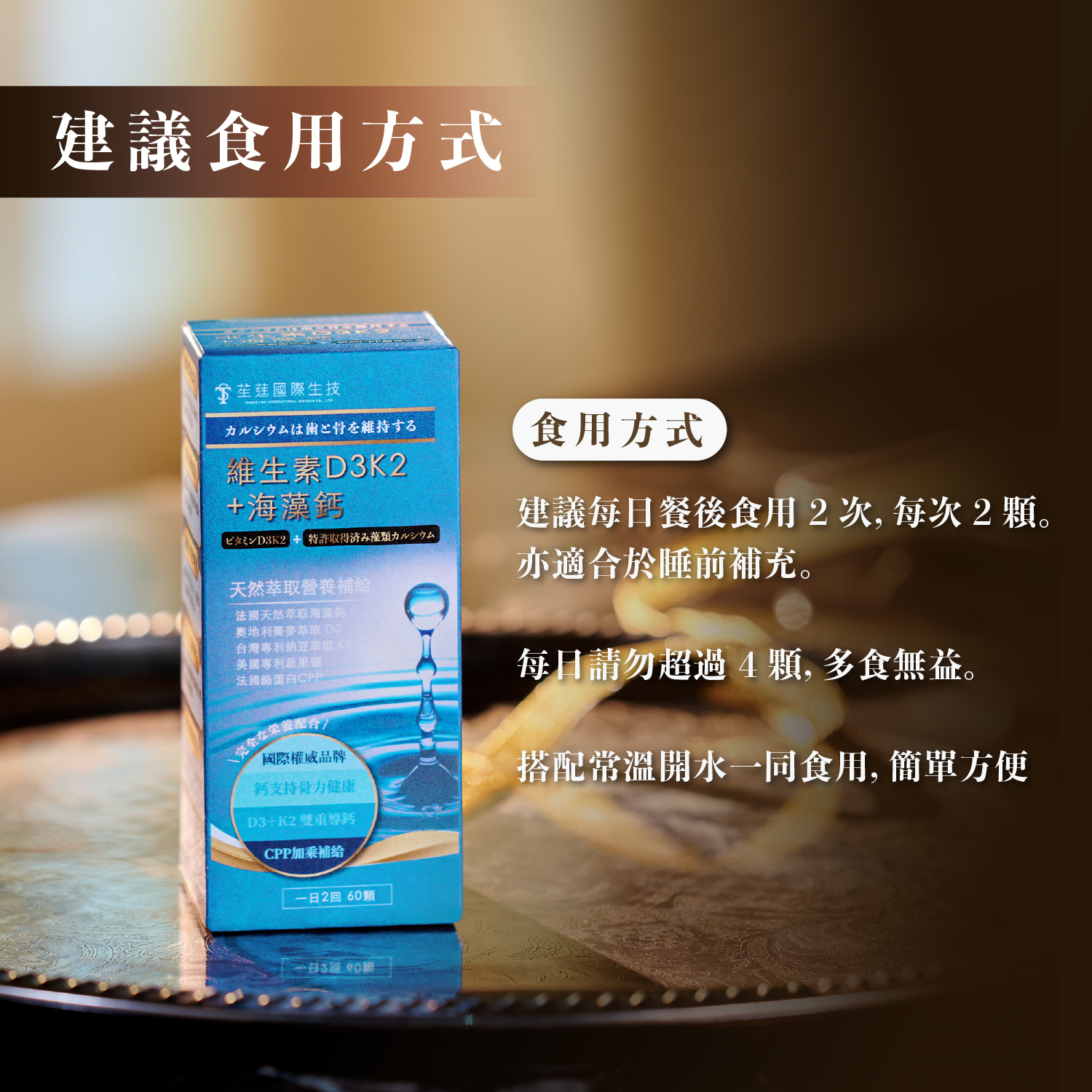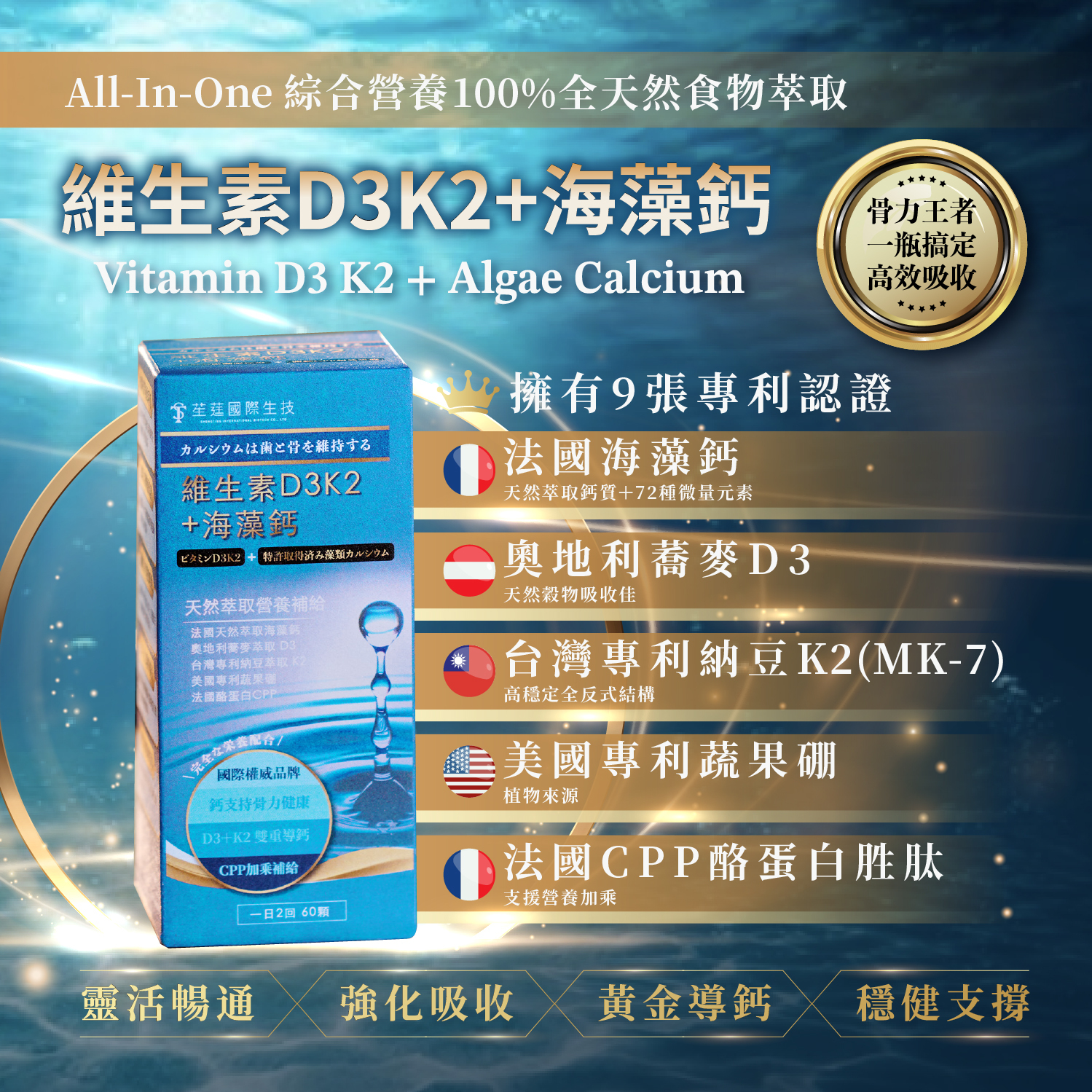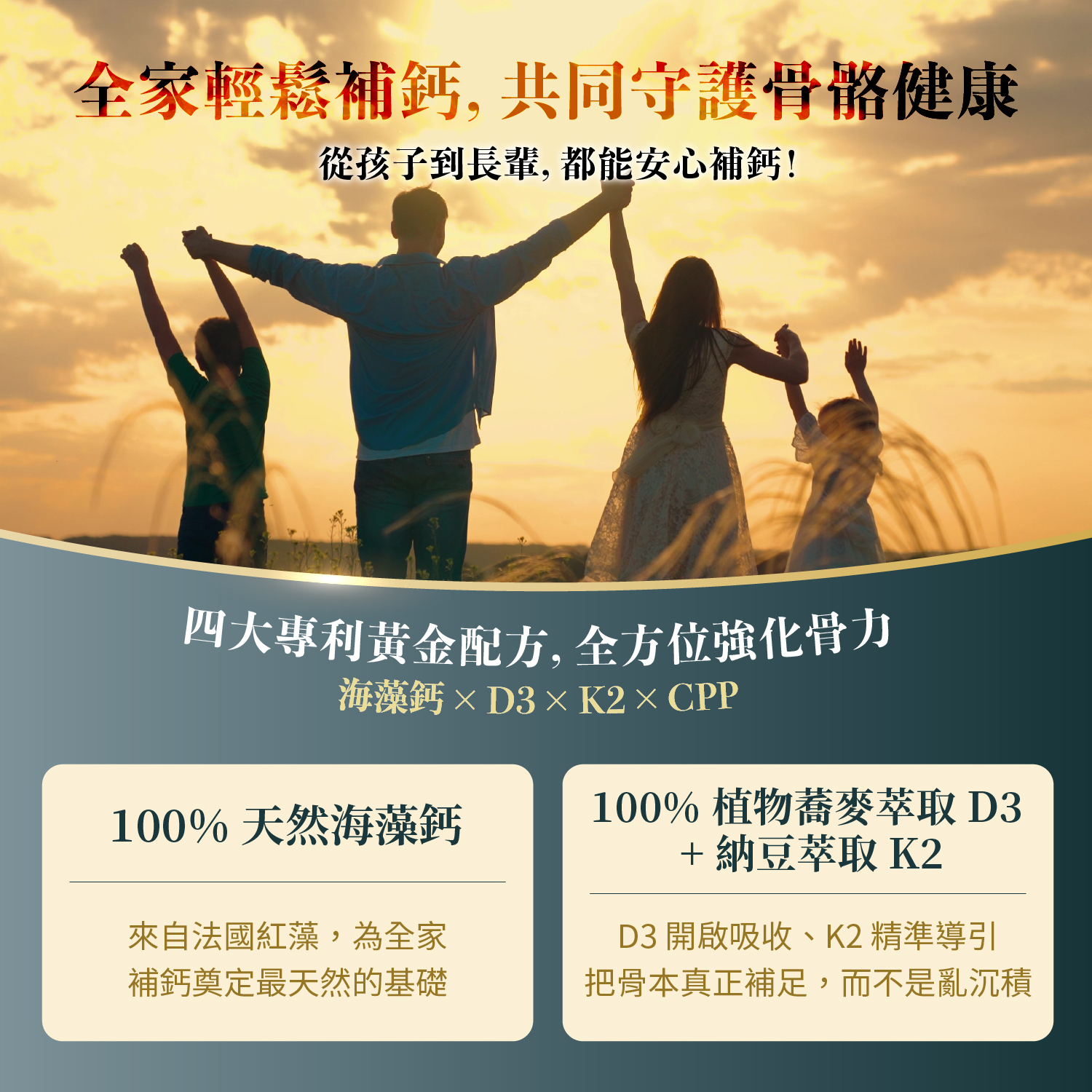 ▸ 100% 天然食物萃取:法國天然海藻鈣 500 mg+奧地利蕎麥維生素 D3 400 IU+台灣專利納豆維生素 K2(MK-7)120 μg