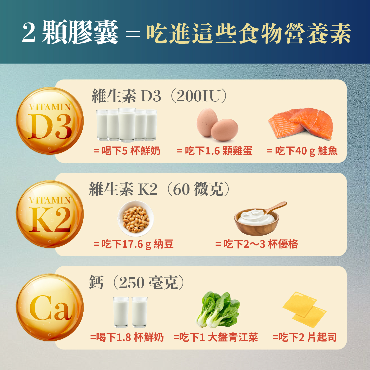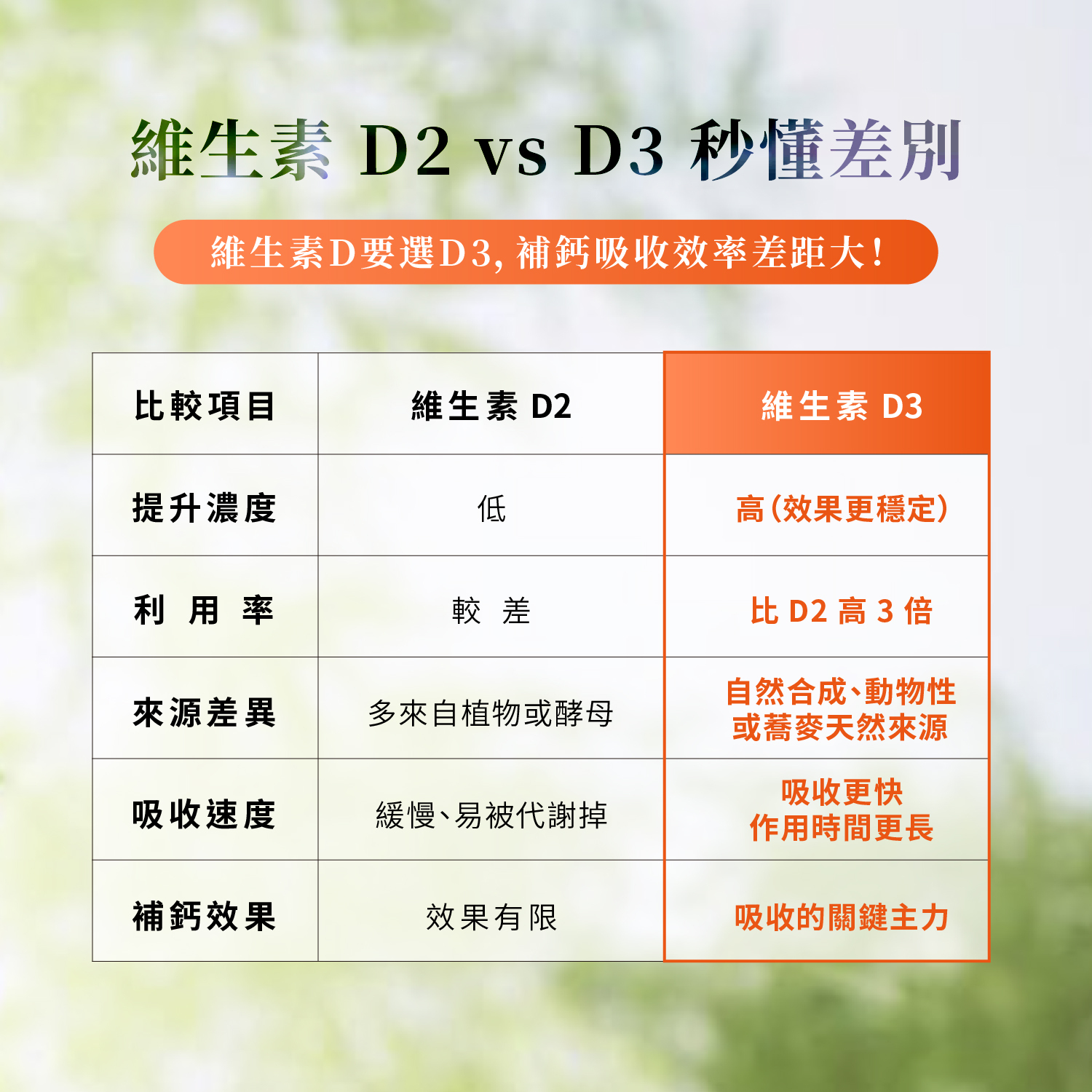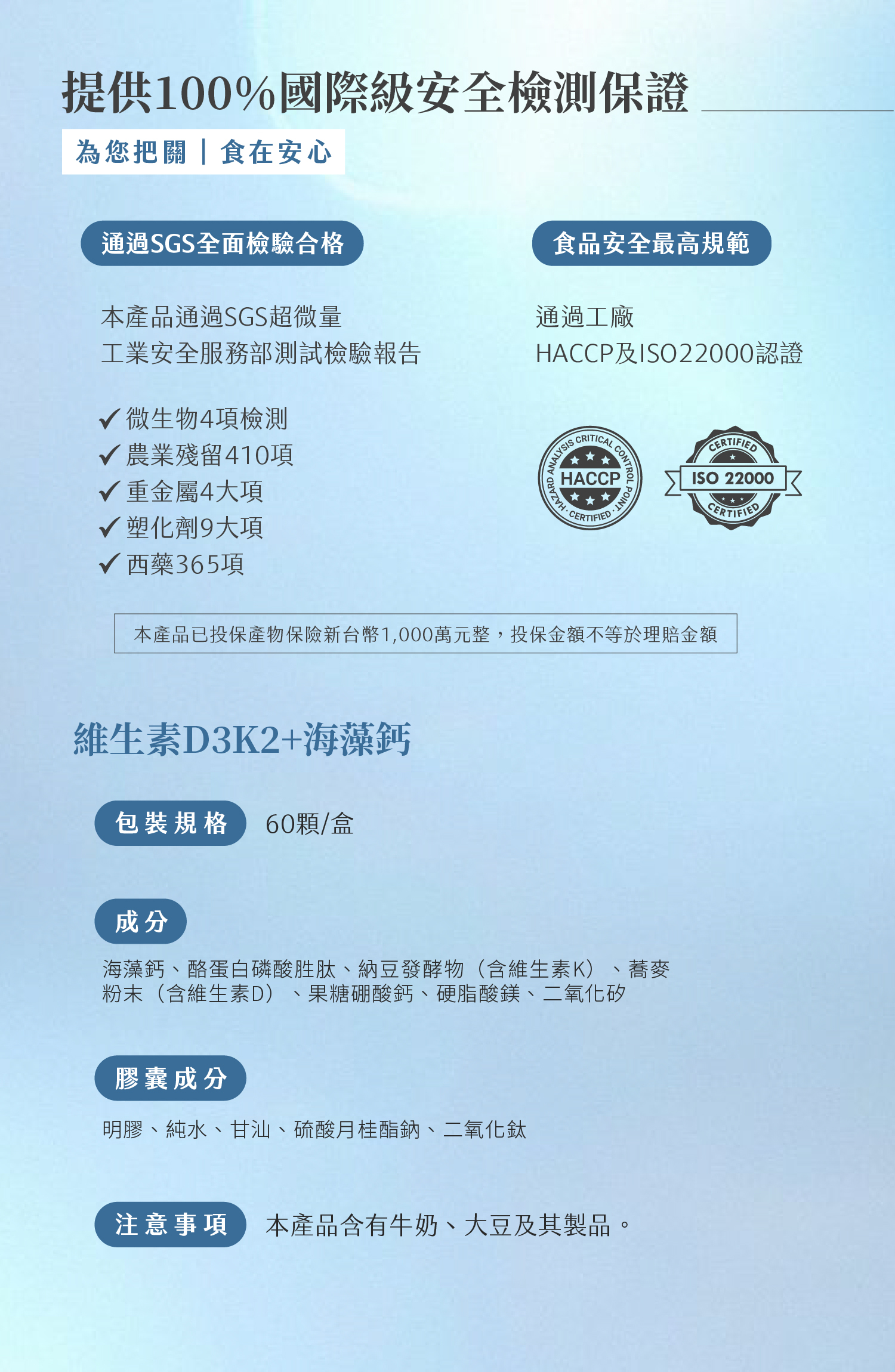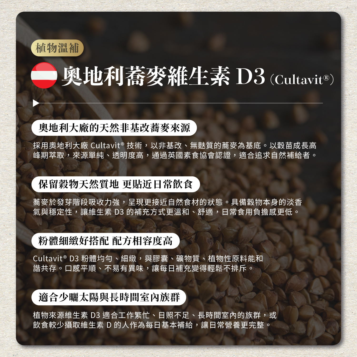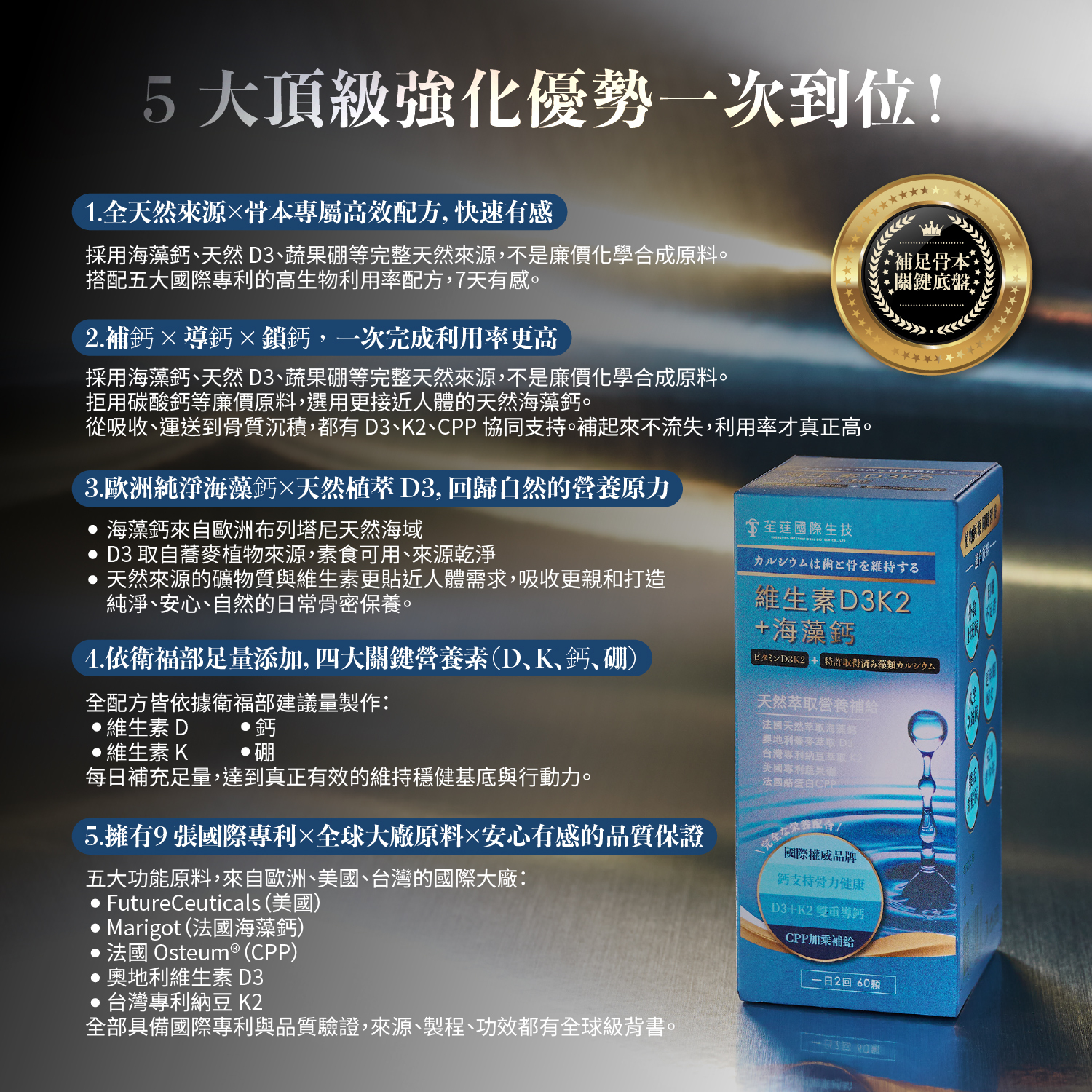 ▸ 100% 天然食物萃取:法國天然海藻鈣 500 mg+奧地利蕎麥維生素 D3 400 IU+台灣專利納豆維生素 K2(MK-7)120 μg
