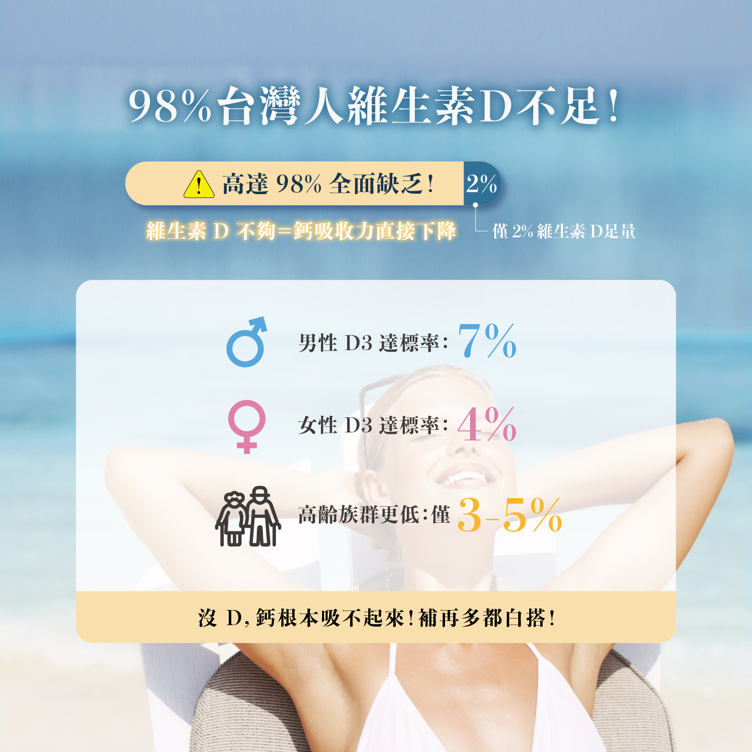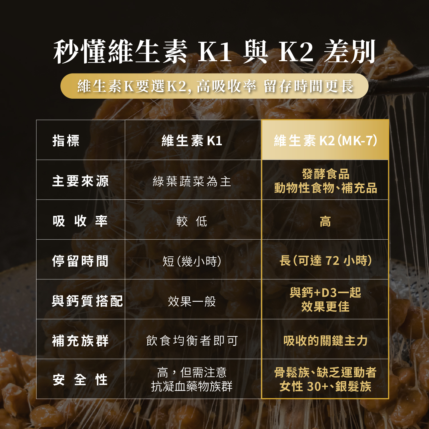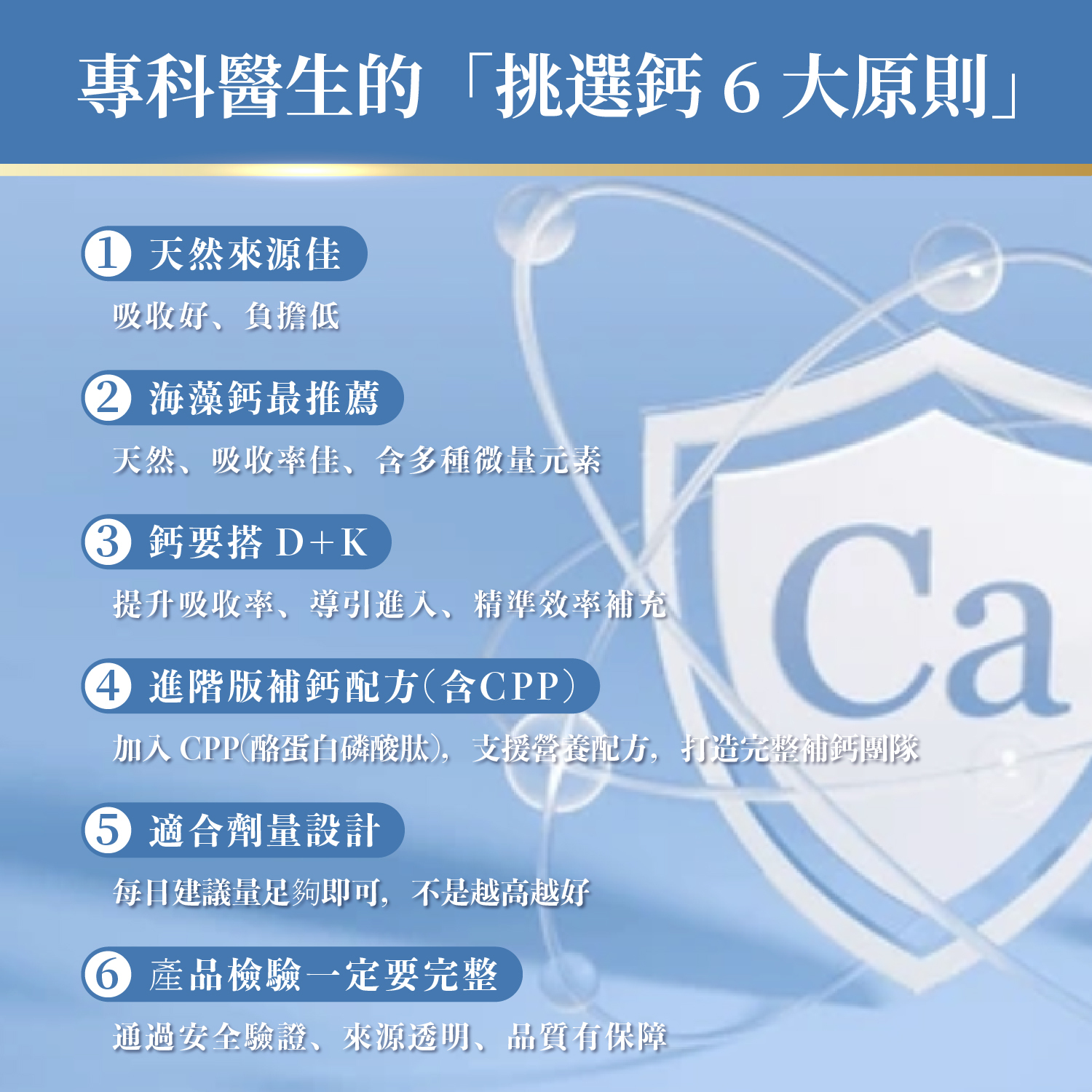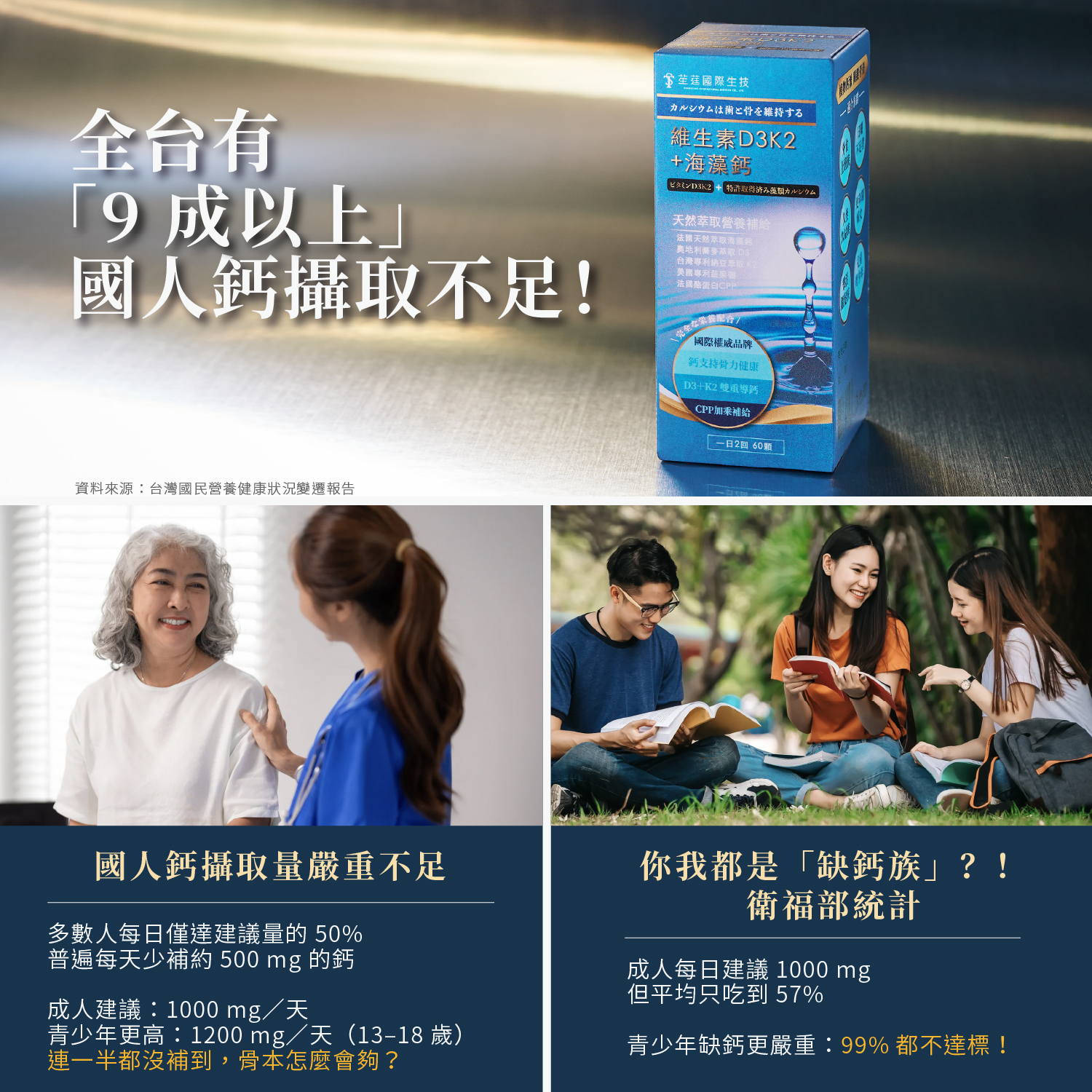 ▸ 100% 天然食物萃取:法國天然海藻鈣 500 mg+奧地利蕎麥維生素 D3 400 IU+台灣專利納豆維生素 K2(MK-7)120 μg