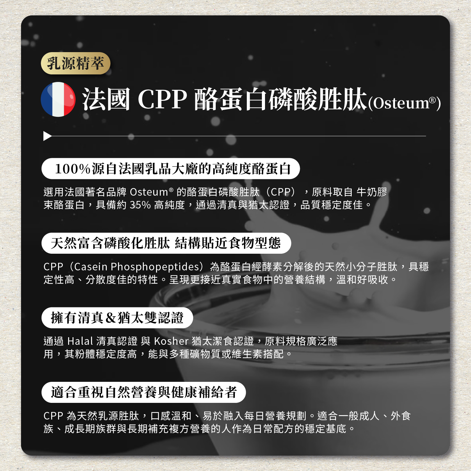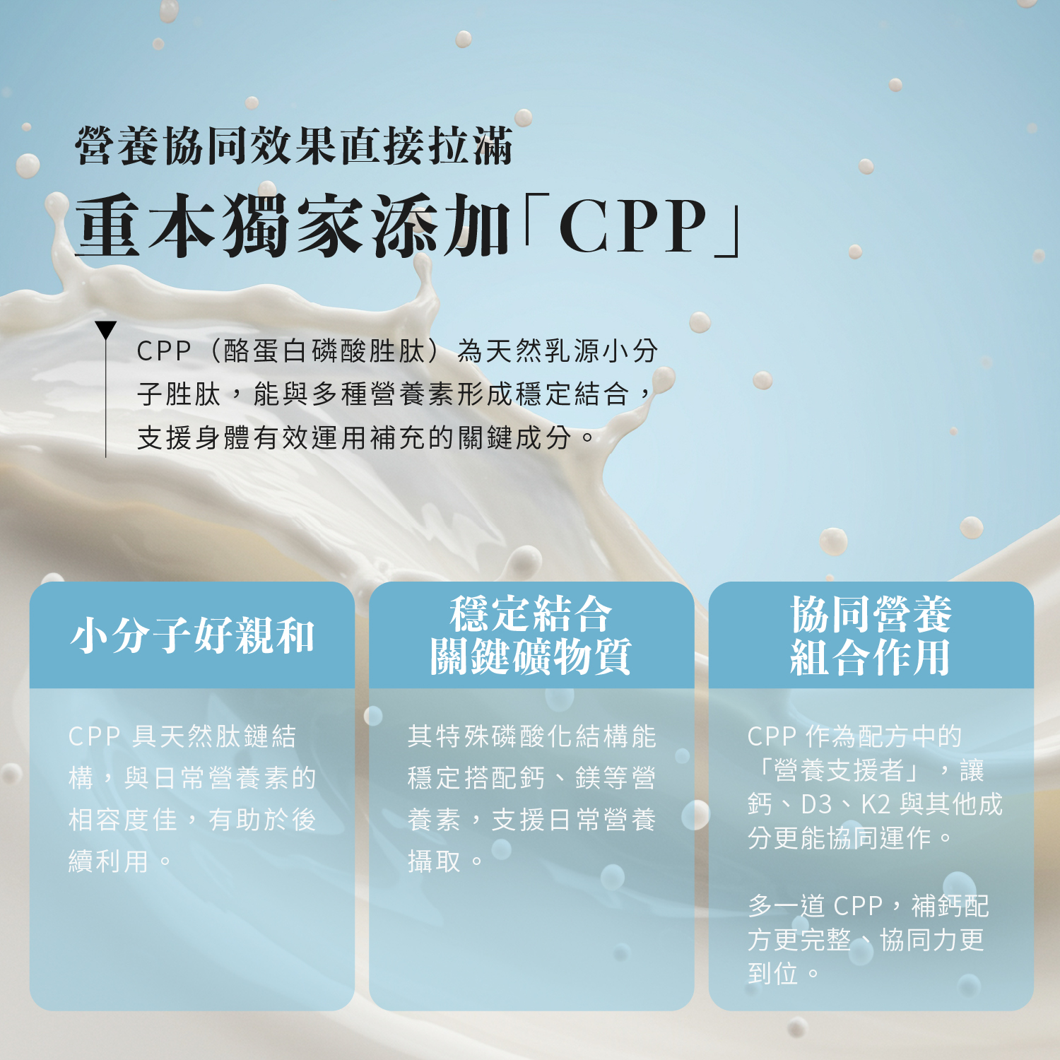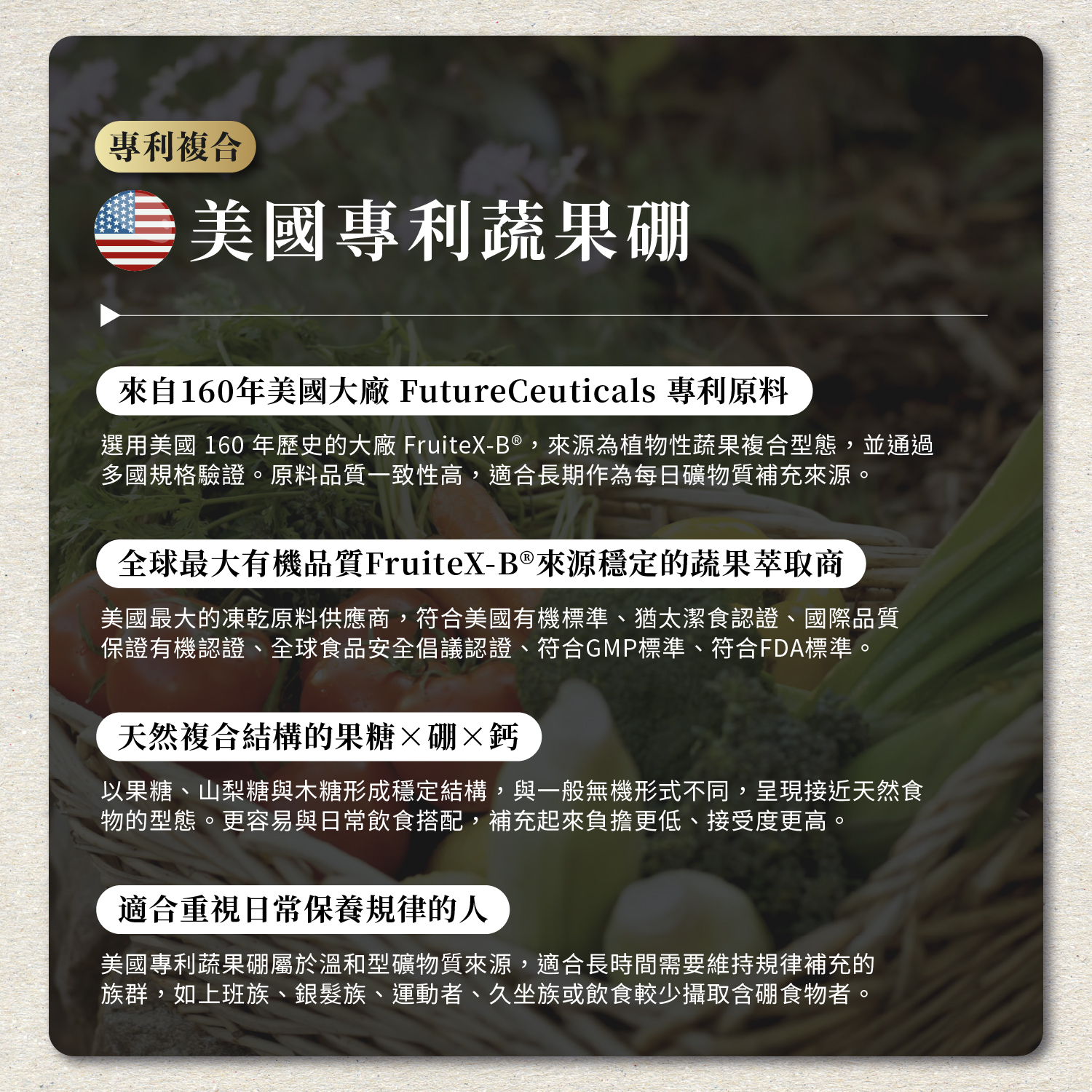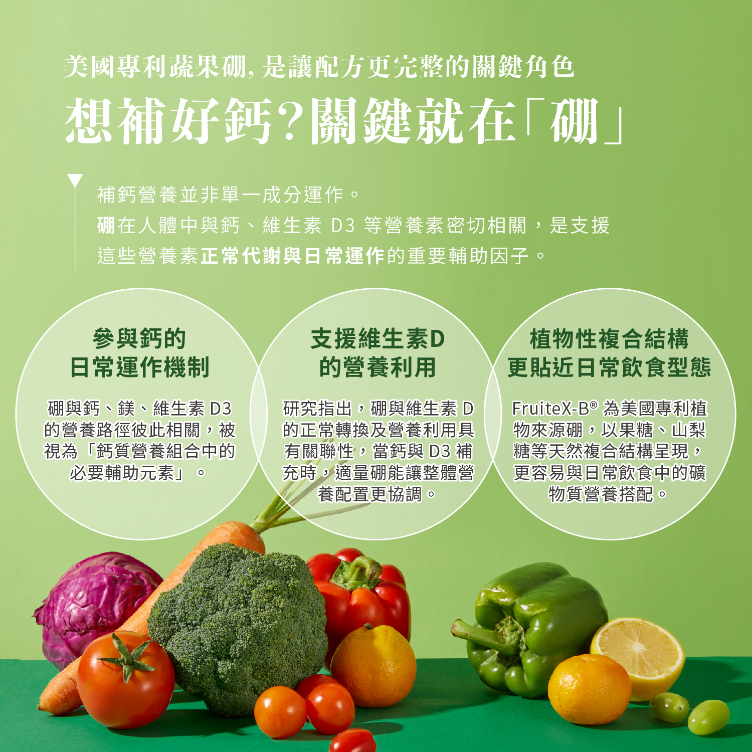 ▸ 專利加乘協同配方:美國專利蔬果硼+法國 CPP 酪蛋白磷酸胜肽,強化營養利用率,打造完整補鈣團隊